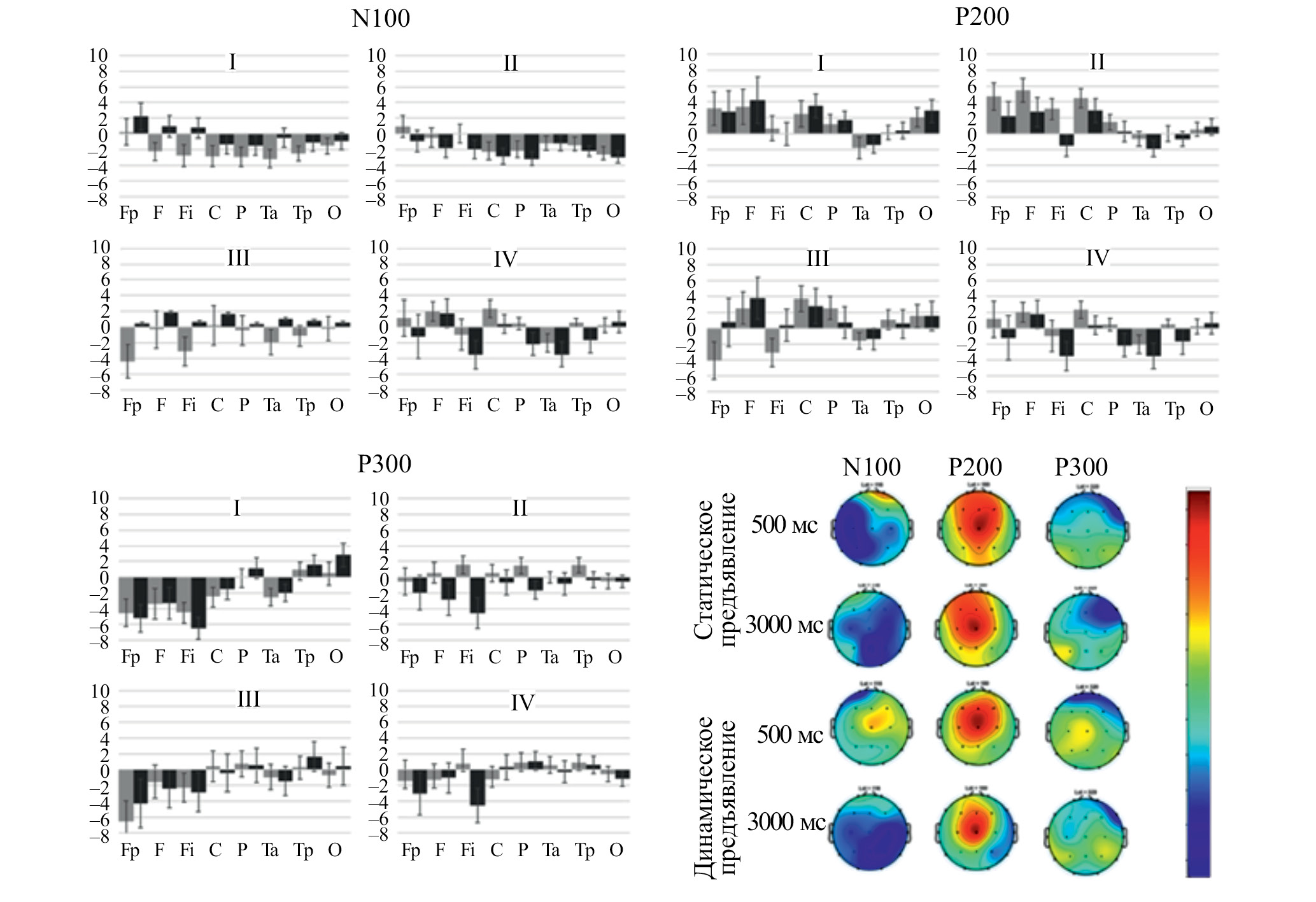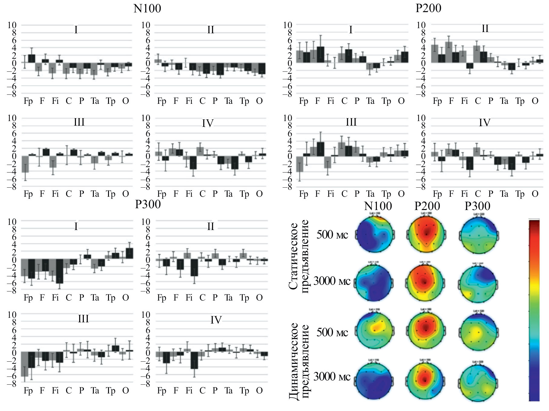 Рис. 3. Задача удержания и последующего воспроизведения ломаных линий. Усредненные значения 3 компонентов ССП на императивный сигнал (в мкв) и их амплитудные карты. Бары погрешностей отражают двусторонние значения SEM. Для каждого компонента I, III – задержка 500 мс; II, IV – задержка 3000 мс; I, II – статический режим; III, IV – динамический режим. Серые столбики – левое полушарие, черные столбики – правое полушарие. Обозначения псевдоотведений: Fp – Fp1/2; F – F3/4: Fi – F7/8; C – C3/4; P – P3/4; Ta – T3/4; Tp – T5/6, O – O1/O2. Цветовая шкала характеризует амплитуду соответствующего компонента, нормированную на абсолютную величину максимального отклонения этого компонента от 0, синий цвет – отклонение в сторону отрицательных значений, красный – в сторону положительных значений.