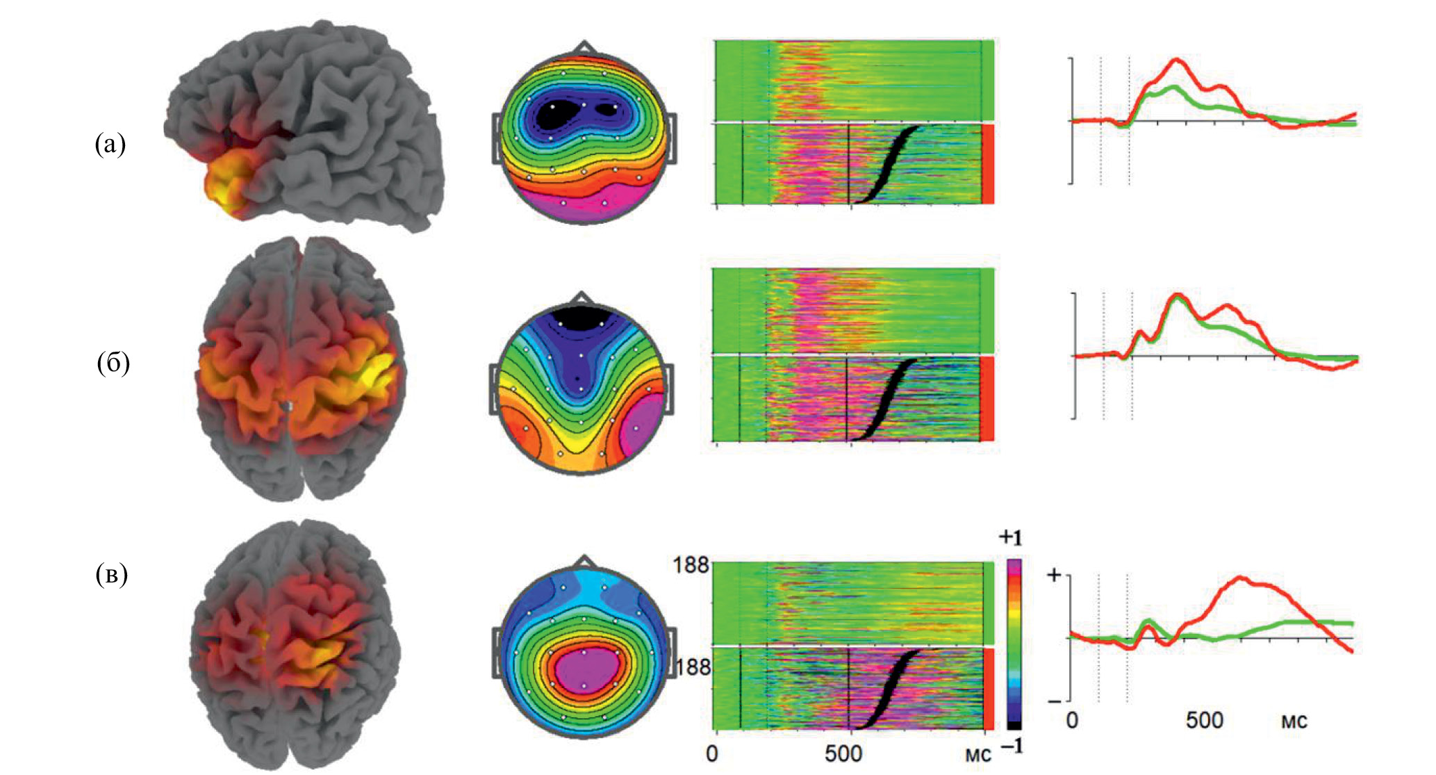 Рис. 2. Скрытые компоненты ПСС: (а) – первая, (б) – вторая, (в) – третья, индивидуальные и усредненные по всем испытуемым. ПСС на длинный стимул – красная линия, на короткий – зеленая. Слева направо: локализация ПСС по sLORETA, топография компонент, прямоугольные растры индивидуальных компонент (каждая горизонтальная линия на растре представляет индивидуальный ПСС, цвет которого кодирует амплитуду этого ПСС) и графики ПСС для коротких (зеленые линии) и длинных стимулов (красные линии). Для получения разложения использовались следующие записи ПСС: 1-я и 2-я записи для групп «методика и «контроль». Индивидуальные ПСС в растрах выстроены по мере увеличения времени реакции (сверху вниз), время реакции на девиантный стимул отображено черным цветом. По правой стороне растра цветом указано условие ПСС: длинный сигнал – красная вертикальная полоса, короткий – зеленая вертикальная полоса.