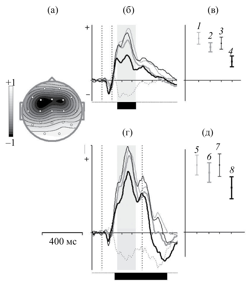 ПСС были вычислены отдельно для каждого условия и каждого испытуемого методом усреднения во временном интервале от –100 до 900 мс. Для вычисления индивидуальных, усредненных по отведениям ПСС использовали записи ЭЭГ, содержавшие не менее 30 безартефактных проб, соответствующих правильным ответам. ПСС вычислялись путем усреднения ЭЭГ в пробах, принадлежащих двум разным категориям раздельно: «короткий» звук, являющийся стандартным нерелевантным стимулом ODDBALL-парадигмы, «длинный» звук – девиантный релевантный стимул. Вычисление усреднений для индивидуальных и групповых ПСС происходило независимо для каждого отведения и каждой группы.