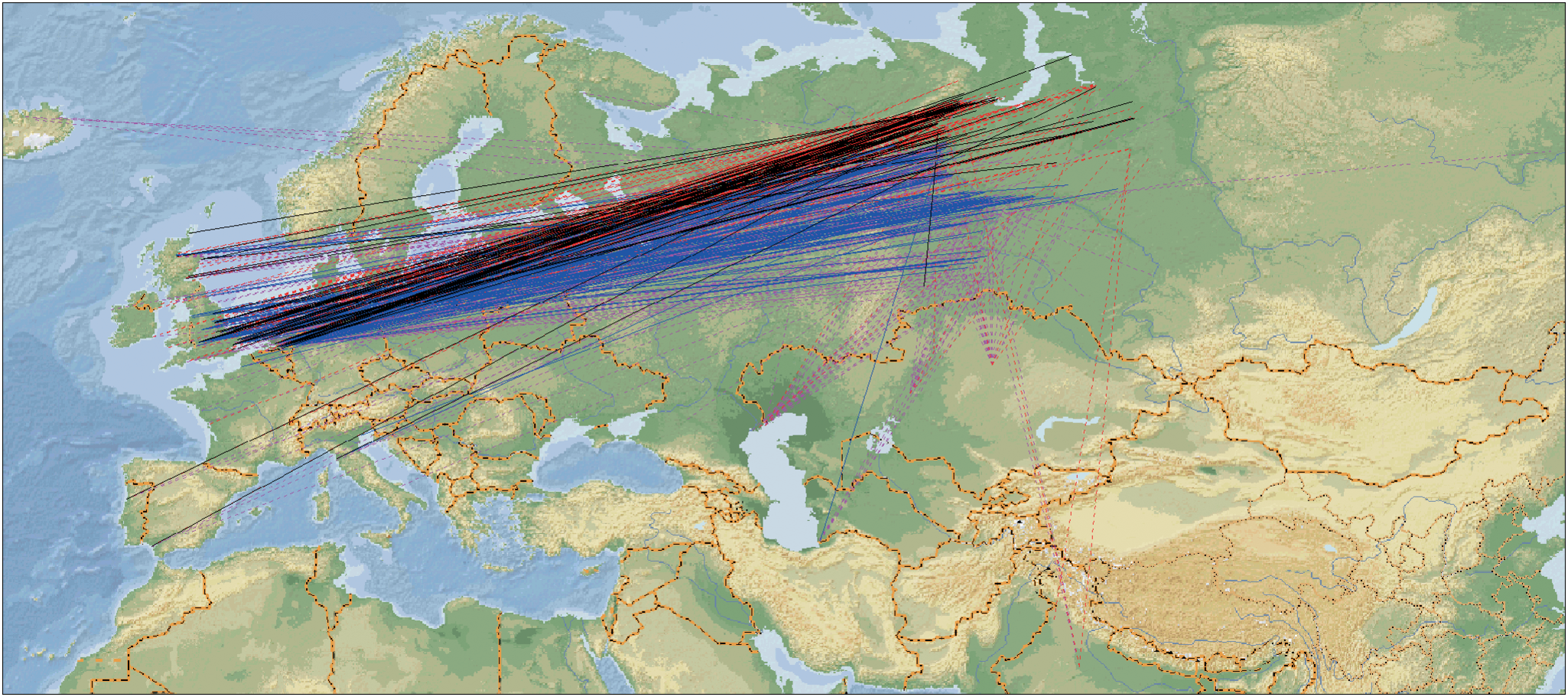 Миграционные связи водоплавающих птиц севера Западной Сибири рассмотрены на основе обработки материалов находок меченых птиц из базы данных Научно-информационного центра кольцевания птиц ИПЭЭ им. А.Н. Северцова РАН. Использовали 3531 возврат колец от водоплавающих птиц 29 видов. Водоплавающие птицы региона характеризуются исключительно широкими связями и встречаются в разные сезоны в большинстве регионов Старого Света в пределах северного полушария: от Исландии до Японских о-вов и от Западной Африки до п-ова Индостан и бассейна р. Янцзы. Рассмотрены дальние перелеты птиц к местам линьки, межгодовая смена регионов гнездования и зимовок, а также распределение на зимовках. Выделено 10 регионов зимовок. Имеющийся материал по миграциям водоплавающих птиц оценен с точки зрения полноты описания их сезонного распределения и его значения в изучении экологических связей территории Западной Сибири.