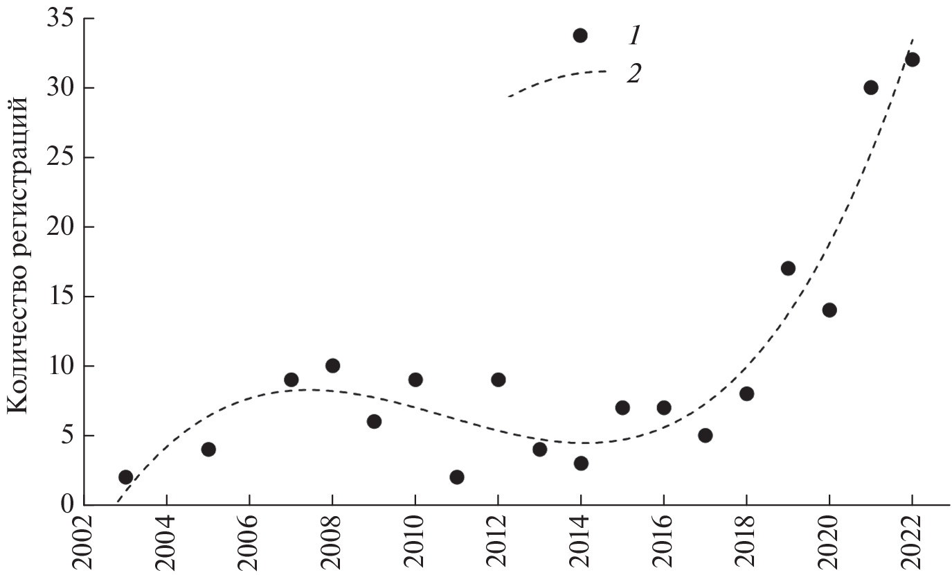 Юго-восточная Фенноскандия, включающая в себя территорию Республики Карелия и смежные с ней районы Ленинградской и Архангельской областей, до последнего времени остается наименее изученным регионом на Европейском Севере в отношении статуса обыкновенного ежа (Erinaceus europaeus). В статье анализируются данные о современных (2001–2022 гг.) находках вида (собственные наблюдения авторов и сведения респондентов) – 182 случая встреч ежей (212 экз.). Показаны пространственно-временны́е особенности регистрации вида, характеризующиеся расширением мест локализации и частоты встреч ежа с северо-запада на юго-восток региона. Определены самые северные точки его находок (64.368° N, 30.383° E), в т.ч. сеголетков (63.624°–63.924° N, 30.466°–30.901° E, подзона северной тайги), и первые случаи регистрации вида восточнее Онежского озера в Республике Карелия и Архангельской обл. Выявлены биотопические предпочтения и уровень использования видом урбанизированных территорий на севере ареала: высокая доля регистрации ежа в лиственном (34.0% от общего количества учтенных животных) и смешанном (19.3%) лесу, в сельскохозяйственных угодьях (10.8%), дачных поселках (16.5%) и населенных пунктах (9.0%). На вырубках, в сосняках, в ельниках, на болотах, на заброшенных хуторах и в отдельно стоящих лесных постройках встречи ежа минимальны (0.5–6.1%). Среди общего количества встреч ежа преобладает случайное визуальное обнаружение человеком (80.8%), тогда как домашние собаки обнаружили 19.2% ежей. Весной первые ежи зарегистрированы 25.04–11.05, последние встречи осенью отмечены 2–17.09. Количество случаев регистрации ежей в течение активного периода их жизнедеятельности минимально в апреле (1.1%), резко возрастает в мае–июне (16.7 и 17.8% соответственно), максимально в июле и августе (30.0 и 24.4%) и резко снижается в сентябре (10.0%). Получен ряд показателей состояния популяции: среднее количество сеголетков в выводке составило 2.8 экз., их доля от общего количества зарегистрированных ежей – 24.5%, преобладание среди взрослых животных активных одиночек (86.3%), значительно реже – активных пар (7.6%) и самок с выводком (6.1%). Основная причина гибели зверьков – наезд автотранспорта на дорогах (77.4%). Потепление климата и изменение структуры лесов позволяют предположить дальнейшее расширение мест находок ежа, в т.ч. на трансформированных и урбанизированных территориях подзоны северной тайги.