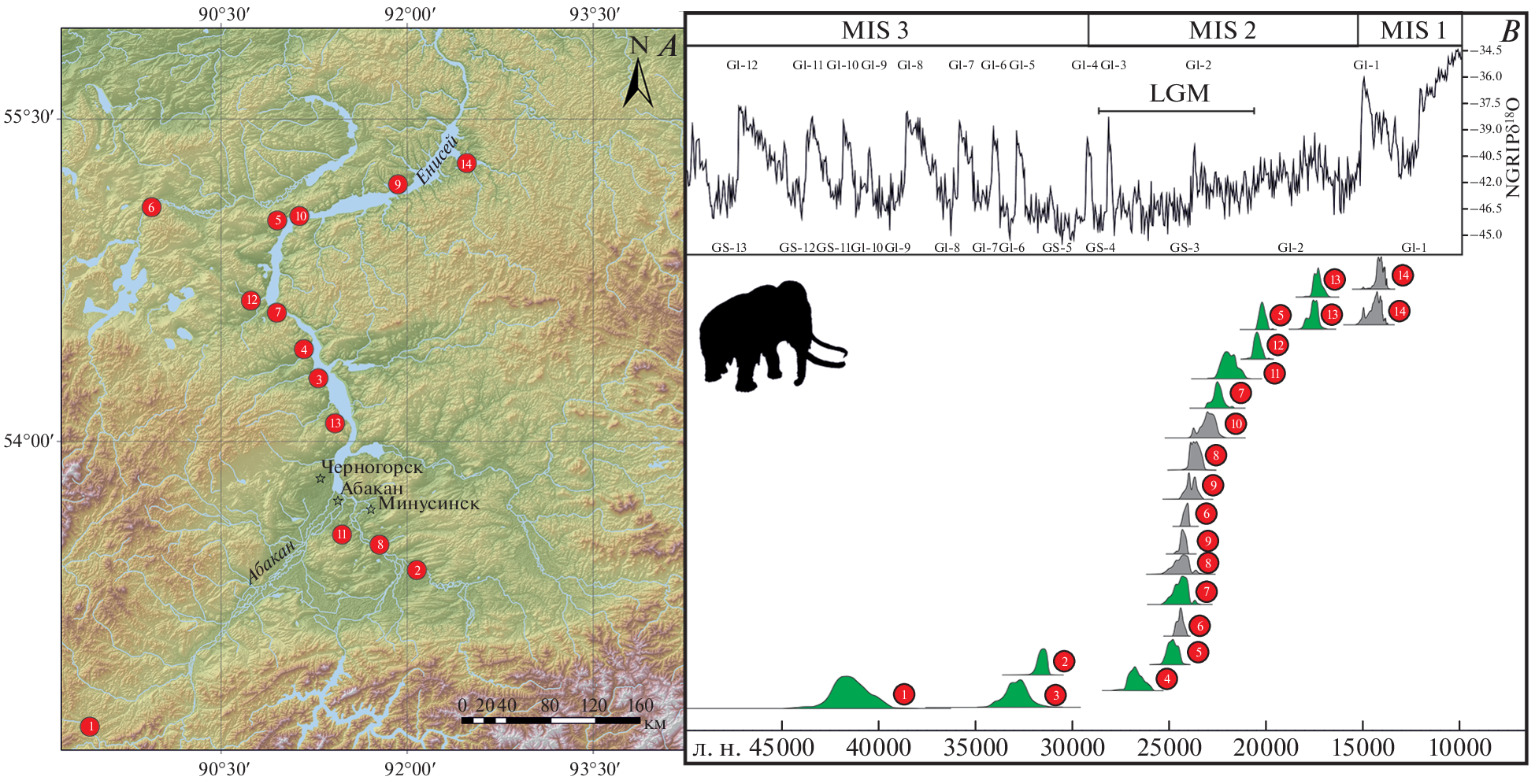 Радиоуглеродное датирование остатков шерстистых мамонтов Минусинской котловины позволило уточнить особенности и сроки распространения вида на юге Сибири в позднем плейстоцене. В данной работе показано, что на юге Сибири мамонты были наиболее многочисленны в холодные периоды, а максимальной численности этот вид достиг в период последнего ледникового максимума. На данный момент нет ни одной находки мамонта, которую можно было бы с уверенностью отнести к теплому временно́му интервалу. Возможно, в теплые интервалы позднего плейстоцена условия на юге Сибири были неблагоприятны для постоянного обитания вида Mammuthus primigenius. В целом, мамонты Минусинской котловины сохраняют видоспецифические особенности содержания стабильных изотопов углерода и азота (δ13С и δ15N) в коллагене костей по сравнению с другими крупными травоядными. Для них отмечены максимально высокие значения δ15N с самыми низкими δ13С; северные олени, напротив, показывают самые низкие значения δ15N и высокие δ13С. Изотопный сигнал других видов растительноядных млекопитающих располагается между показателями мамонтов и северных оленей. Сравнение полученных данных стабильных изотопов углерода и азота (δ13С и δ15N) остатков шерстистых мамонтов Минусинской котловины с аналогичными показателями у животных севера Восточной Сибири выявляет существенные различия. Одна из возможных причин такого явления – различия в рационе животных Минусинской котловины и мамонтов других популяций. Однако сходные тенденции (относительно более низкое содержание δ15N и более высокое содержание δ13С) в позднем плейстоцене характерны и для северных оленей, и для шерстистых носорогов Минусинской котловины. Это позволяет предполагать, что различия остатков мамонтов Минусинской котловины и мамонтов северных территорий по изотопному составу углерода и азота связаны не только с типом питания, но и c несколько разным изотопным фоном регионов, обусловленным местной средой.