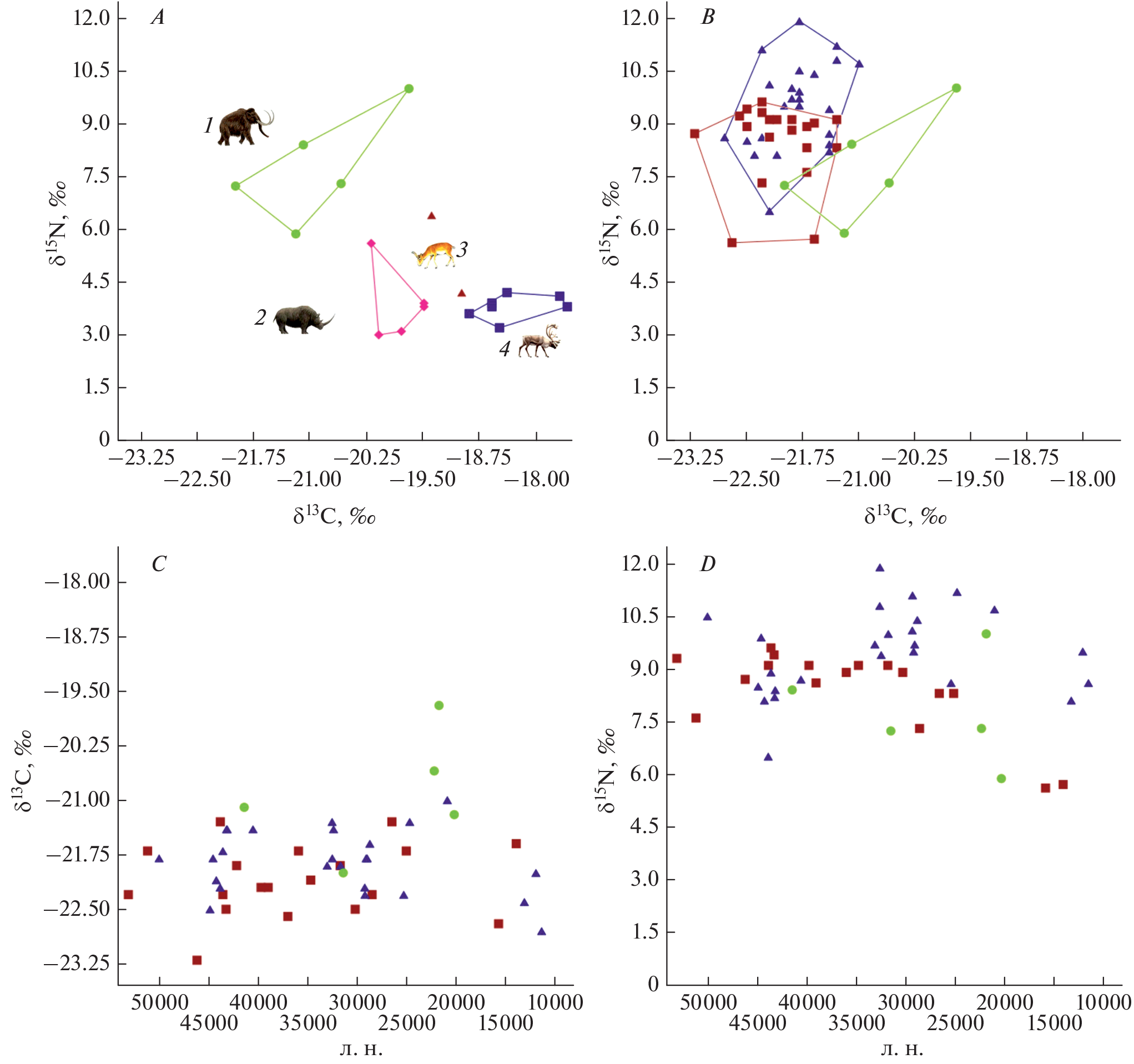 - Iacumin P., Davanzo S., Nikolaev V.I., 2006. Spatial and temporal variations in the 13C/12C and 15N/14N ratios of mammoth hairs: Palaeodiet and palaeoclimatic implications // Chemical Geology. V. 231. P. 16–25.