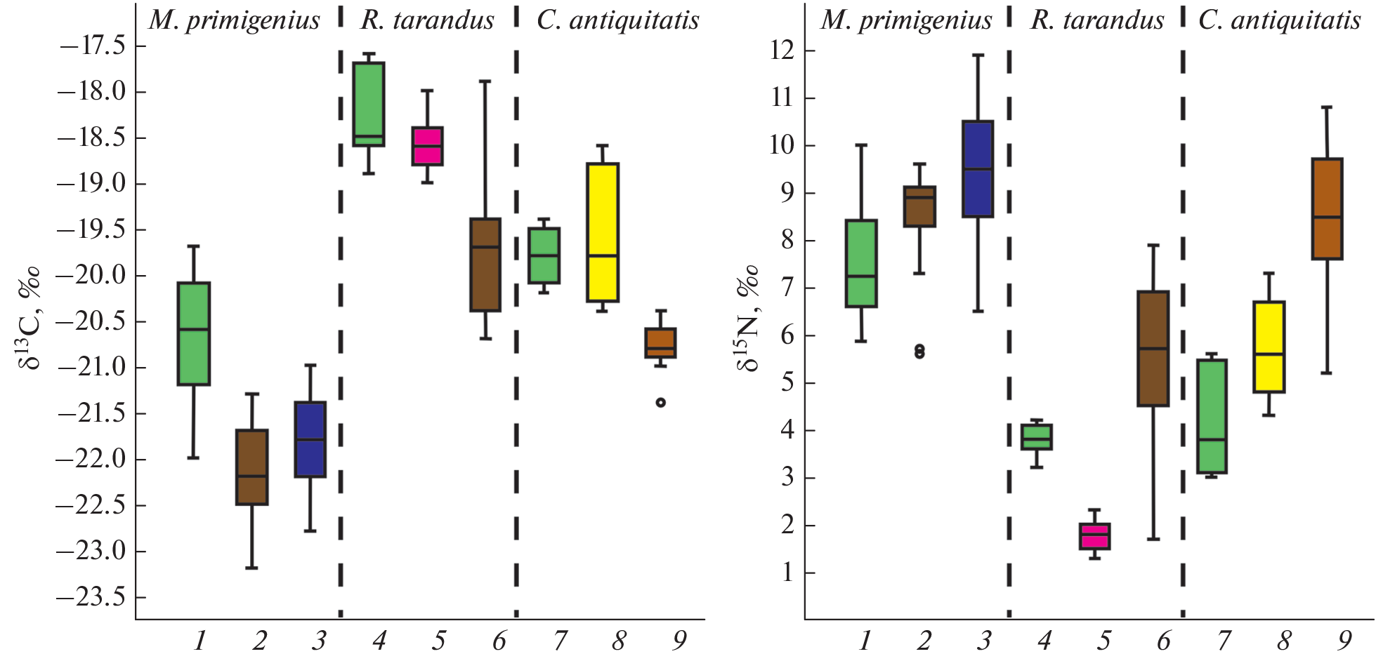 - Drucker D.G., Hobson K.A., Münzel S.C., Pike-Tay A., 2012. Intra-individual variation in stable carbon (δ13C) and nitrogen (δ15N) isotopes in mandibles of modern caribou of Qamanirjuaq (Rangifer tarandus groenlandicus) and Banks Island (Rangifer tarandus pearyi): Implications for tracing seasonal and temporal changes in diet // International Journal of Osteoarchaeology. V. 22 (4). P. 494–504.
