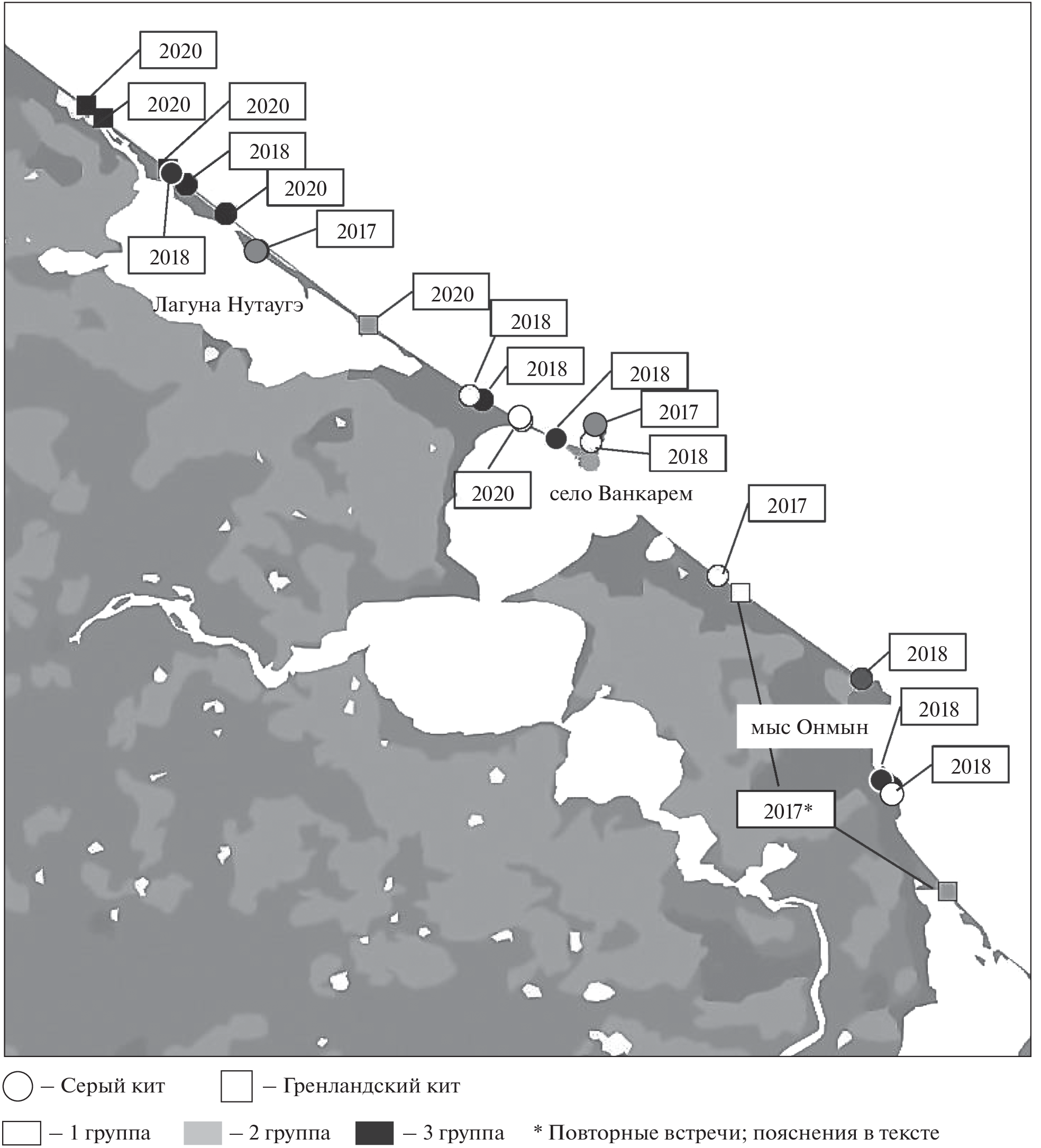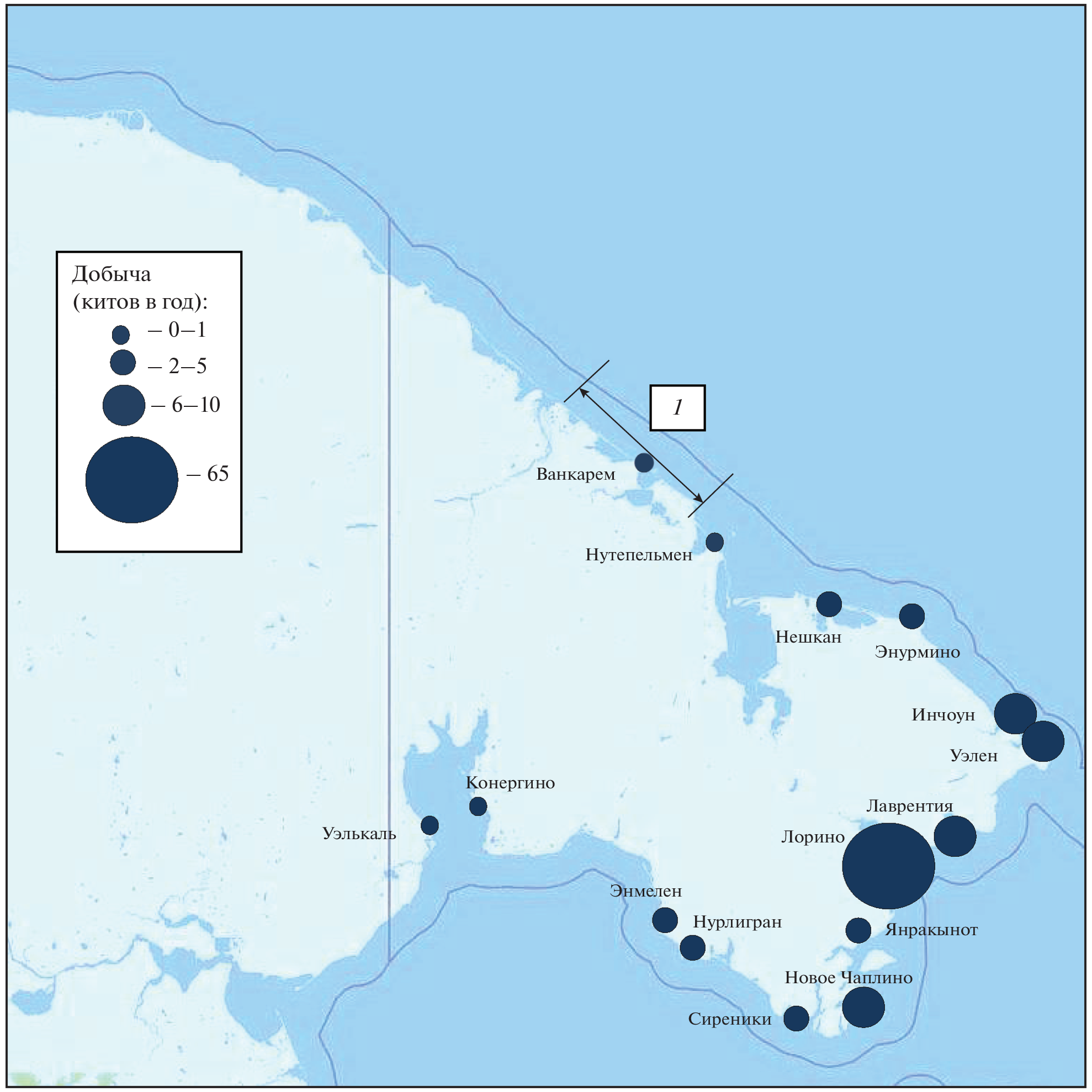 Six species of cetaceans have been found to occur in the Chukchi Sea adjacent to the Pacific walrus rookery at Cape Vankarem: the Grey whale, the Bowhead whale, the Humpback whale, the Killer whale, the Beluga whale, and the Fin whale. The Humpback whale is noted to have become abundant in the Chukchi Sea in the summer in recent years. The coastal mortality of cetaceans in a 100-km section in the western part of the distribution range of both Gray and Bowhead whales has been established to average 1.66 and 0.3 whales per year, respectively. Mostly young animals of 1–2 years of age appear to die, the main cause of death of which being predation by killer whales. The most common whales in that area in the summer-autumn period are humpback whales, which at the same time form significant concentrations in the coastal waters during the accumulation of the main food items. Both bowhead and gray whales are much less frequent, also being rather irregular to be found, while despite the relative scarcity of encounters these species account for the lion’s share of all dead cetaceans.