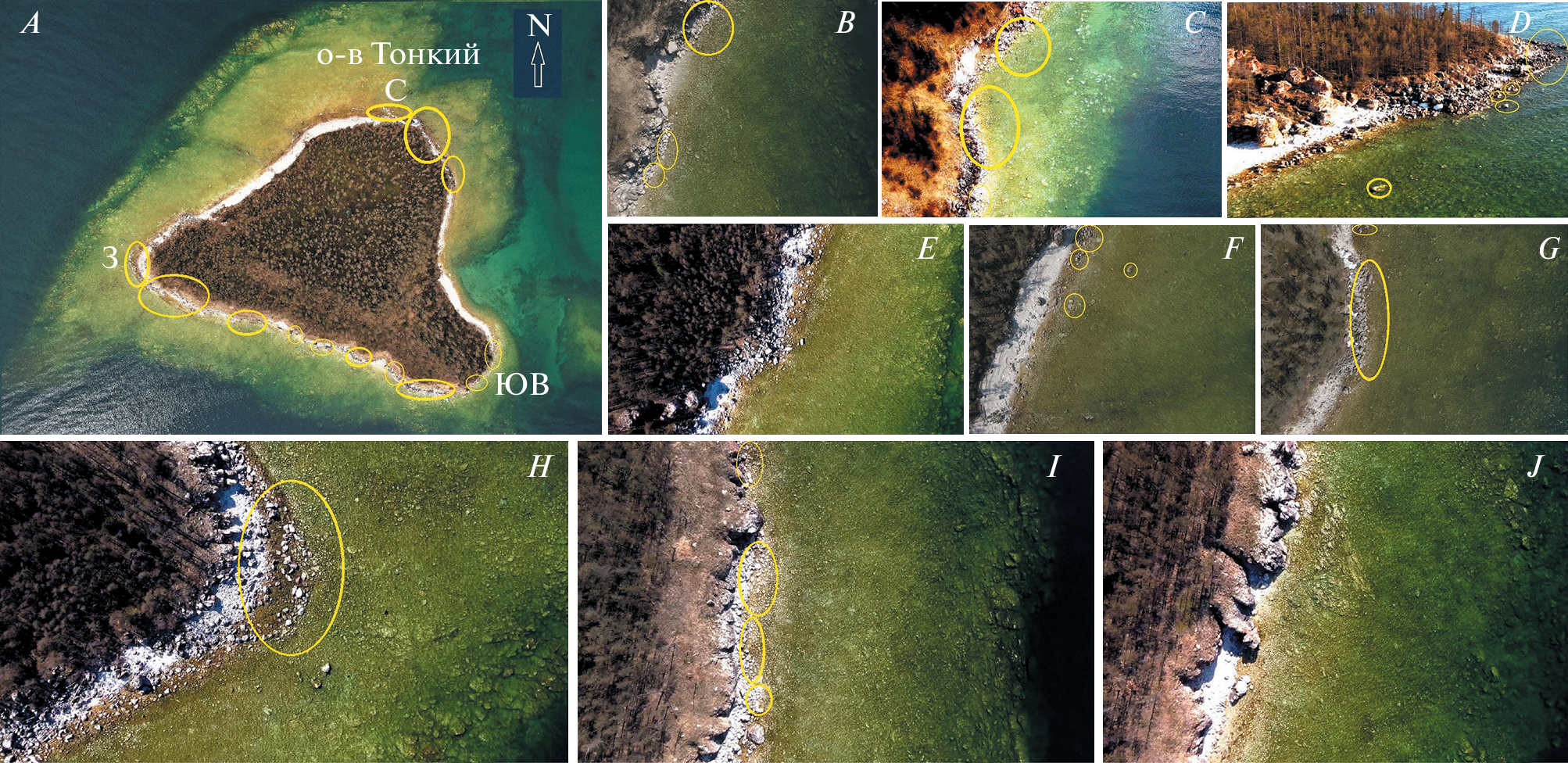 Впервые приведено детальное описание береговой линии Ушканьих островов (озеро Байкал) с целью оценить использование берега байкальской нерпой (Pusa sibirica Gm.) в качестве лежбищ и роль этих лежбищ в годовом цикле тюленей. Для этого использованы видеоматериалы, полученные с помощью БПЛА фирмы “DJI” Mavic 2 Zoom и Air 2 S, и результаты многолетних полевых наблюдений. Полная съемка береговой линии всех четырех островов проведена 29 и 30 мая 2022 г. (при уровне воды 456.40 м над ур. м.), а также 12 и 24 августа (уровень воды, соответственно, 456.79 и 456.83 м над ур. м.). Показано, что по литологической характеристике на о-ве Большой Ушканий около 30% береговой линии пригодны для использования нерпами, однако этого в настоящее время не происходит. Среди трех малых островов у тюленей излюбленным местом для формирования залежек является о-в Круглый (по общей численности животных, зафиксированных на острове и в прибрежных водах), вторым по значимости является о-в Тонкий и третьим – о-в Долгий (здесь смонтирована стационарная видеосистема, передающая информацию в режиме онлайн). На всех островах определены координаты конкретных локаций залежек/лежбищ. В настоящее время около 35% протяженности береговой линии трех малых Ушканьих островов в той или иной степени используются нерпой под залежки. В современных климатических условиях лежбища на малых Ушканьих островах, по-видимому, играют исключительно важную роль для значительной части популяции (каждый сезон их посещают несколько тысяч особей), поскольку большинство других лежбищ и локаций, которые нерпы могли бы использовать в качестве таковых, подвержены сильному антропогенному воздействию.