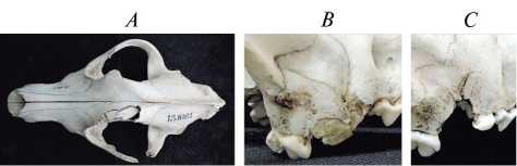 Рис. 1. Фрагменты черепов волка с травмами, полученными в результате внутривидовых агрессивных контактов: A – череп № 13.90.1, стрелкой показана вершина обломившегося клыка; B – череп № 13.24, травма нёбного отростка правой верхнечелюстной кости; C – частично зажившее отверстие от клыка ниже и каудальнее заглазничного отростка на черепе № 13.41.3.