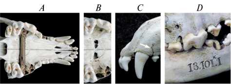 Рис. 3. Примеры случайных травм: A – череп волка № 13.98.1, вентральный вид с застрявшим между противоположными зубами Р4 и М1 фрагментом ветки; B – тот же череп без фрагмента ветки; C – фрагмент черепа волка 13.185.1, левый латеральный вид, вертикальная трещина между C и P1; D – фрагмент черепа волка № 13.101.1, правый латеральный вид.