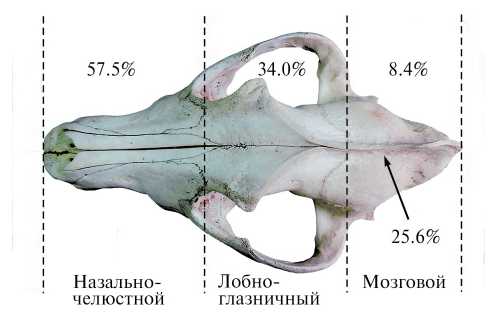 Из 297 черепов 129 (43.4 ± 2.9%) имели травмы различного происхождения или деформированный сагиттальный гребень. Без учета сагиттального гребня уровень травматизма составляет 32.3 ± 2.7%. При топографическом подразделении черепа на три отдела – назально-челюстной (от переднего края резцовых костей до лобно-верхнечелюстного шва), лобно-глазничный (от лобно-верхнечелюстного шва до лобно-теменного шва) и мозговой (от лобно-теменного шва до заднего края межтеменной кости) – распределение травм по отделам оказывается неравномерным (рис. 5).