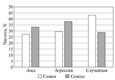 На диаграмме представлена частота травм, полученных от разных причин, у самцов и самок (рис. 6). Наибольшие различия между полами оказались в частоте случайных травм, однако и они лежат вне порога достоверности по критерию Фишера.