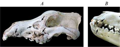 Рис. 8. Травмы, полученные волками в результате удара копытом обороняющегося лося в область зубного ряда, левый латеральный вид: A – череп № 1.11.2; B – фрагмент нижней челюсти черепа № 1.18.1.