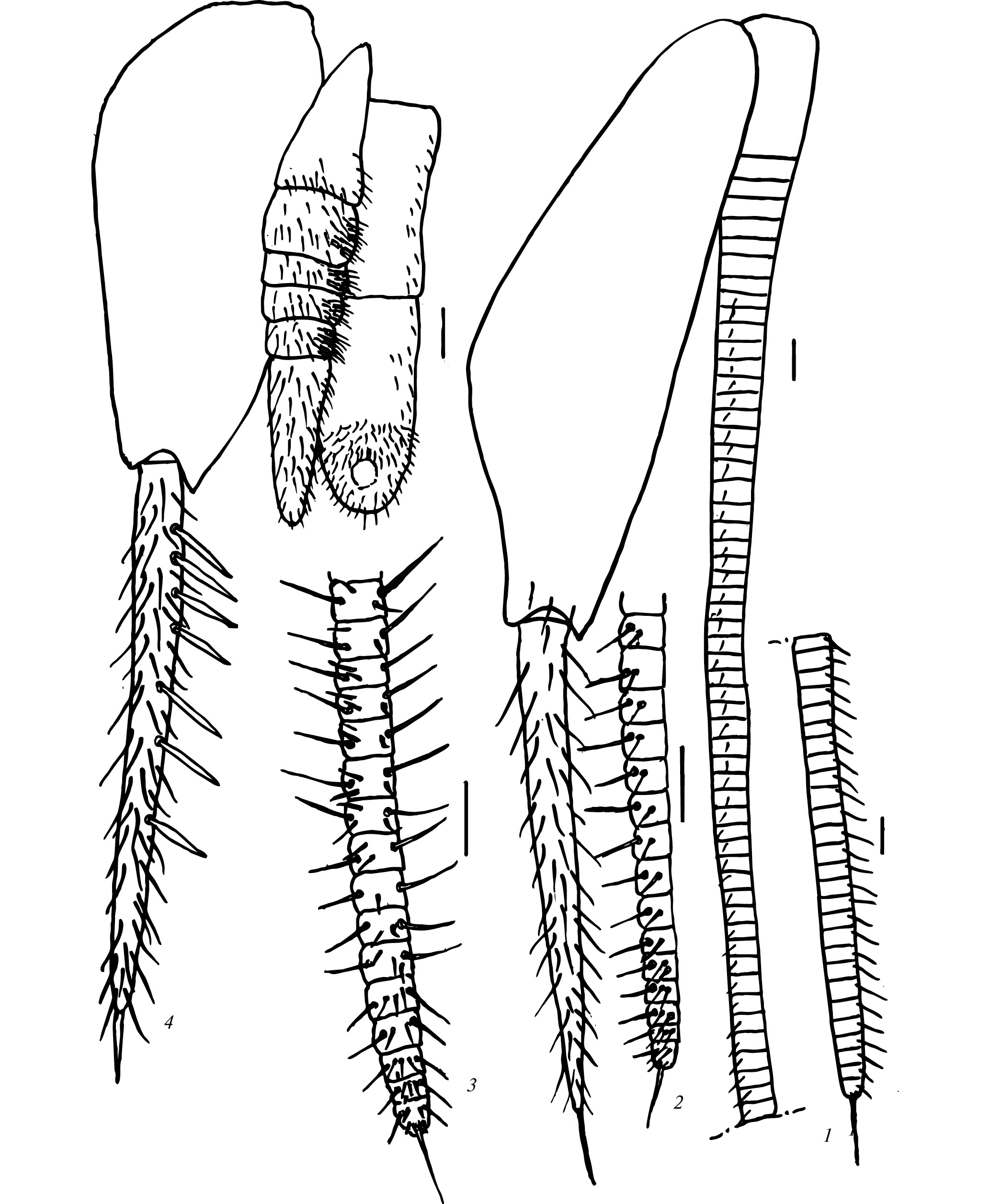 Рис. 2. Allopsontus tauricus sp. n., детали строения полового аппарата самки и самца: 1 – коксит IX c грифельком и задний гонапофиз яйцеклада самки; 2 – 1–15-й дистальные членики заднего гонапофиза яйцеклада; 3 – 1–16-й членики переднего гонапофиза яйцеклада; 4 – пенис, парамер и коксит IX сегмента брюшка самца c грифельком (1–3 – паратип, самка; 4 – голотип, самец). Масштаб 0.1 мм.