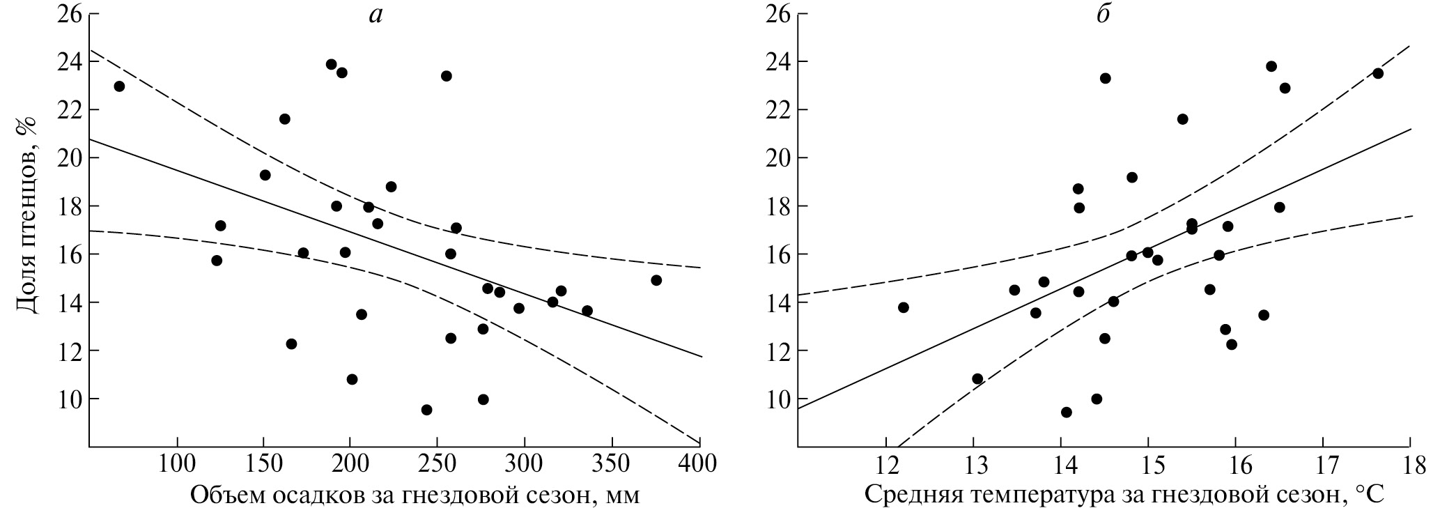 Рис. 4. Корреляция доли птенцов серых журавлей в предотлетном скоплении с параметрами погоды в течение гнездового сезона: а – отрицательная корреляция с количеством осадков (p < 0.01), б – положительная корреляция с температурой (p < 0.005).