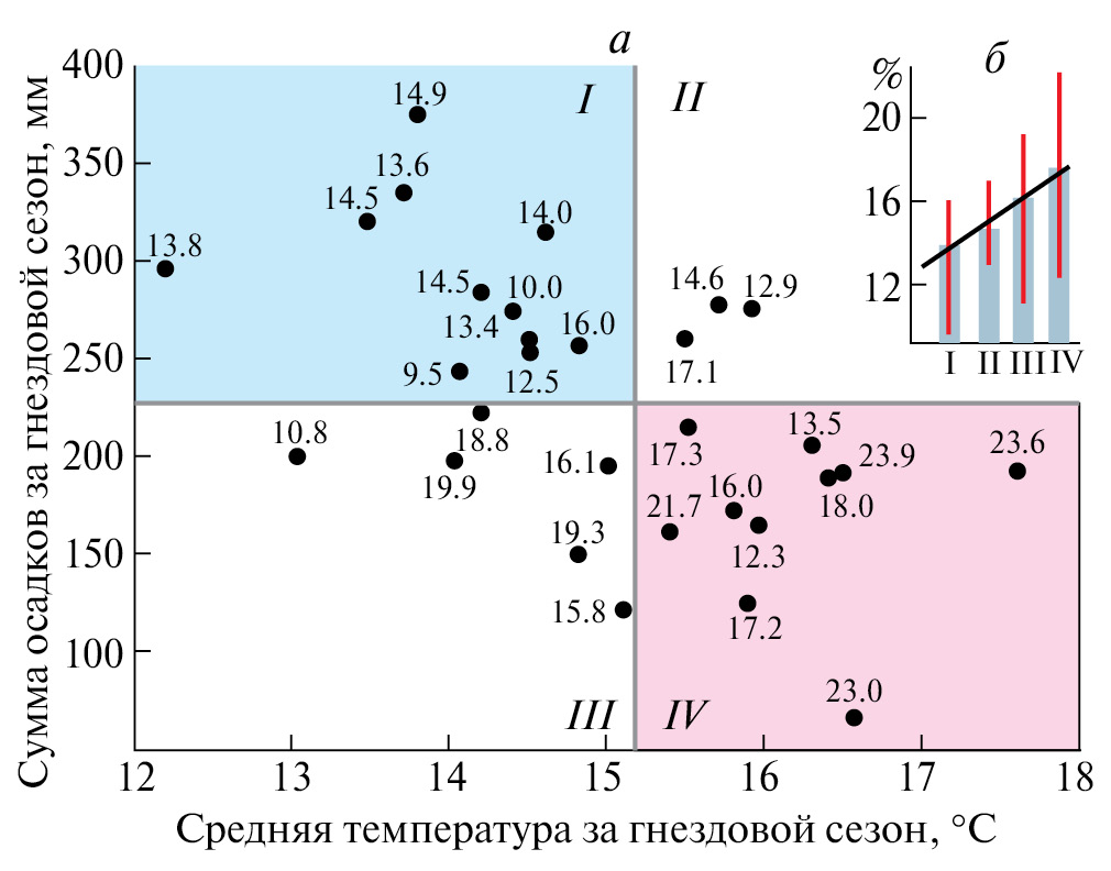 Поскольку два наиболее значимых параметра – средняя температура воздуха и количество осадков за гнездовой сезон – имеют противоположное влияние на успешность размножения, была проведена ординация, которая позволила детализировать совместное влияние этих факторов. В каждом из факторов рассматривали по 2 варианта: больше среднемноголетнего значения / меньше среднемноголетнего значения, в результате такое сочетание параметров дает 4 возможные комбинации: I – годы с большим количеством осадков и низкими температурами, II – годы с большим количеством осадков и высокими температурами, III – годы с небольшим количеством осадков и низкими температурами, IV – годы с небольшим количеством осадков и высокими температурами (рис. 6).
