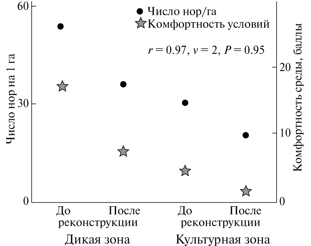 Разница в заселенности зон отлична от той, которая ожидалась при неизбирательном заселении (табл. 3). Кормовые условия в дикой зоне формально были несколько хуже, чем в культурной (табл. 2). Однако если принять во внимание, что абсолютные величины составляли в дикой и культурной зонах соответственно 85 и 80 стволов до реконструкции и 69 и 75 после, представляется маловероятным, что эти различия отражаются на плотности населения. Во всяком случае, размещение нор относительно кормовых деревьев не отличается от случайного (рис. 5), то есть в данных условиях связь плотности населения с кормовыми условиями не просматривается. При этом обнаруживается ее тесная связь с комфортностью среды (рис. 6). Таким образом, на полигоне защитные условия в совокупности с фактором беспокойства определяют емкость биотопов и общую численность хомяков.