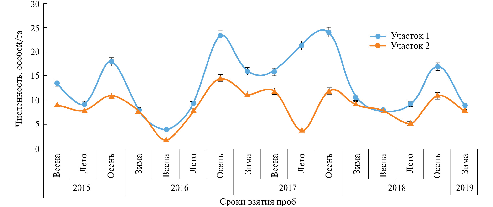 2015 | Весна | 13.6±0.51 | 15 | 10.8–16.1 | 9.3±0.39 | 14 | 6.7–11.4 |