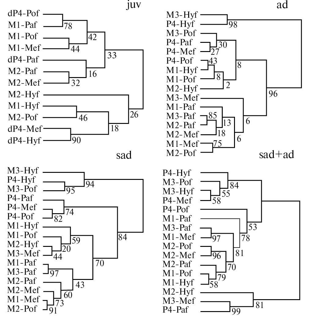 The averaged bootstrap supports of the overall correlation patterns of dental crown elements vary from 37–42 percent in adults and juveniles to 70 percent in subadults and in the combined group. A visual analysis of the structure of phenograms illustrating between-elements correlations in particular age groups (fig. 4) indicated the following. In the juveniles, the most stable were associations between Mef and Hyf in dP4 and less so between Pof in dP4 and Paf in M1 (bootstrap support is 90 and 78 percent respectively), whereas all other associations were much weaker. In subadults, most of the branching points had rather strong bootstrap supports exceeding 50 percent. Most strongly supported (90 and higher percent) were the associations between some homologues in different teeth (Hif in P4 and M3, Paf in M1 and M3) and also strongly to moderately supported (about 70–80 percent or higher) between some elements in the same teeth (Hyf and Pof in M3, Mef and Pof in each of P4 and M2). In the adults, there were several noteworthy rather strongly supported associations of homologues in different teeth (Hif in P4 and M3, Paf in M2 and M3). Regarding the combined group, all branching points had strong bootstrap supports exceeding 50 percent. Among quite strongly supported associations, of interest were those of the elements in the same teeth (Hyf and Pof in M1, Mef and Pof in M2), though one seemingly “odd” association (Paf in M3 with Mef in M1) was also highly supported.