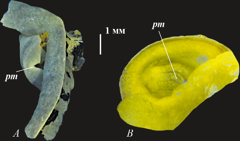 Рис. 2. Пневмостом R. auricularia из оз. Байкал: A – мантийный край особи с открытым пневмостом с уреза залива Загли в Малом Море, B – мантийный край особи с сомкнутыми краями пневмостома из литорали у пос. Листвянка (глубина ~10 м, рис. 1В, станция 4); pm – пневмостом.