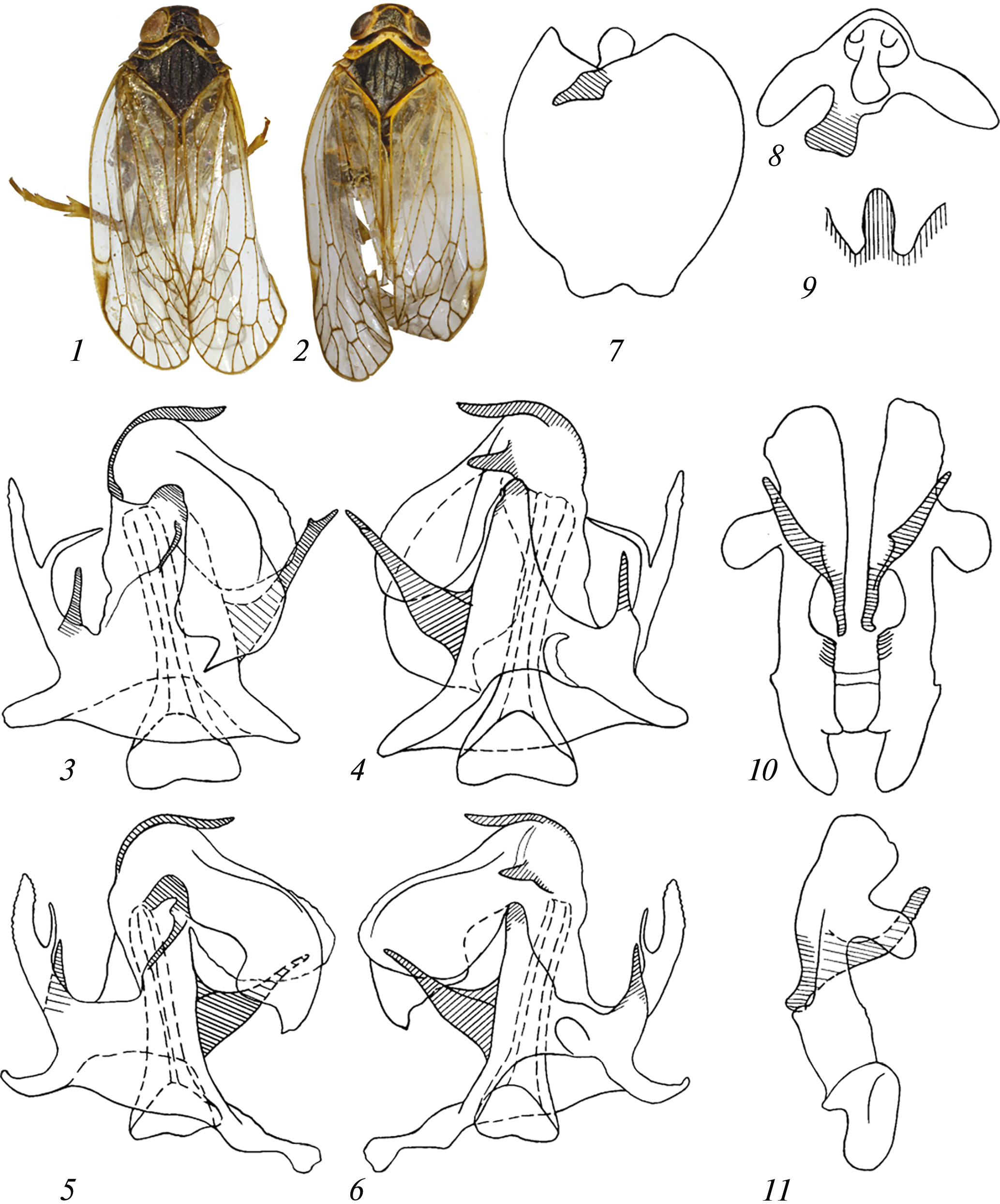 Male genitalia. Left paramere of phallotheca rather short, with three processes of different shape (fig. 1, 3–6). Right paramere straight, more or less uniformly tapering distally, with apex usually somewhat bifurca- ted. Anal tube with truncated posterior process bent to right (fig. 1, 7–8). Ventro-median process of pygofer elongated, incisions on back margin of pygofer on each side of it of approximately same width as process (fig. 1, 9). Styles of almost same shape, apical lobe of right style somewhat shorter and wider than of left one (fig. 1, 10–11).