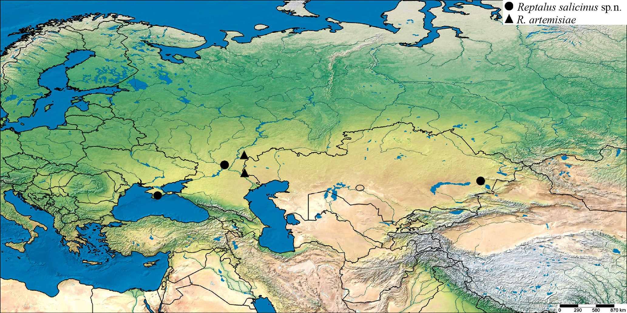 Reptalus artemisiae is known only from the steppes and semi-deserts of the Lower Volga and Trans-Volga regions; evidently, records of R. quinquecostatus from the saline lands of western Kazakhstan by Mityaev (2002) also refer to this species. It should be noted, that so far R. artemisiae was not found on Artemisia subg. Seriphidium in similar biotopes in southern and southeastern Kazakhstan and Kyrgyzstan.