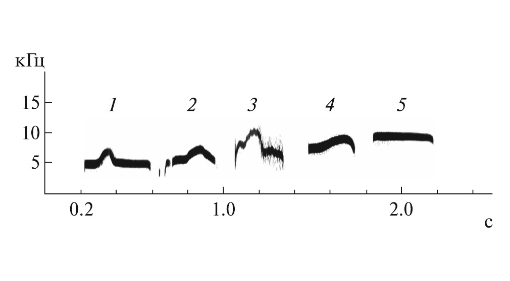 Таким образом, в целом у гибридов сусликов выявлен промежуточный характер наследования биоакустических признаков родительских видов. Но механизм наследования, вероятно, сложный и дискретный и затрагивает как структурные, так и частотные характеристики звуковых сигналов.
