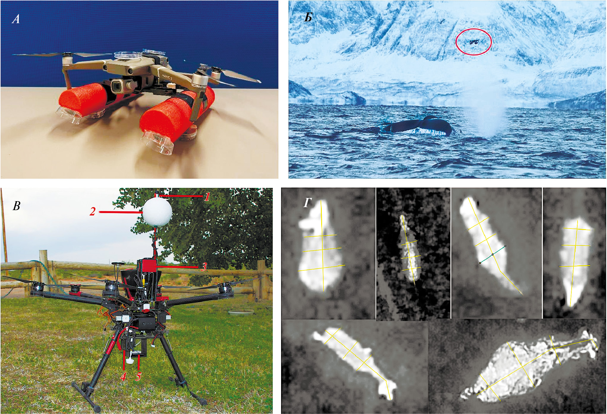 Использование БПЛА позволяет проводить детальные и разносторонние исследования млекопитающих, которые ранее не проводились. Например, параллельное использование двух коптеров – одного с подвешенным гидрофоном и второго, оборудованного стандартной камерой видимого спектра, – позволило получить уникальные данные о связи поведения с акустическими сигналами серых китов (Еschrichtius robustus Lilljeborg 1861) и о параметрах этих сигналов: источнике звука, его частотных и временны́х характеристиках (Frouin-Mouy еt al., 2020). В эксперименте, направленном на изучение формирования альянсов у самцов индийских афалин (Tursiops aduncus (Ehrenberg 1833)), съемка с БПЛА проводилась синхронно с подводным динамиком, с помощью которого исследователи воспроизводили индивидуальные сигналы (свисты) самцов и регистрировали реакции в группе, краткосрочные и видимые только сверху (King еt al., 2021). Нетонущий мультироторный БПЛА (рис. 2А, 2Б) также был использован для забора материала из фонтанов, образуемых выдохом горбатых китов (Mеgaptеra novaеangliaе Borowski 1781) на пути их миграции вблизи берегов Австралии (Pirotta еt al., 2017). На основании собранного материала удалось с высокой точностью определить состав микробиоты китового выдоха, который отражает состояние здоровья животного, а параллельная фотосъемка обеспечила индивидуальную идентификацию каждой исследованной особи. Состояние китов также удалось отследить по снимкам с дрона. Используя 3D-модель тела кита и данные о размерных характеристиках вида, авторы вычислили предполагаемые объем и массу тела каждой снятой с воздуха особи (Christiansеn еt al., 2019).