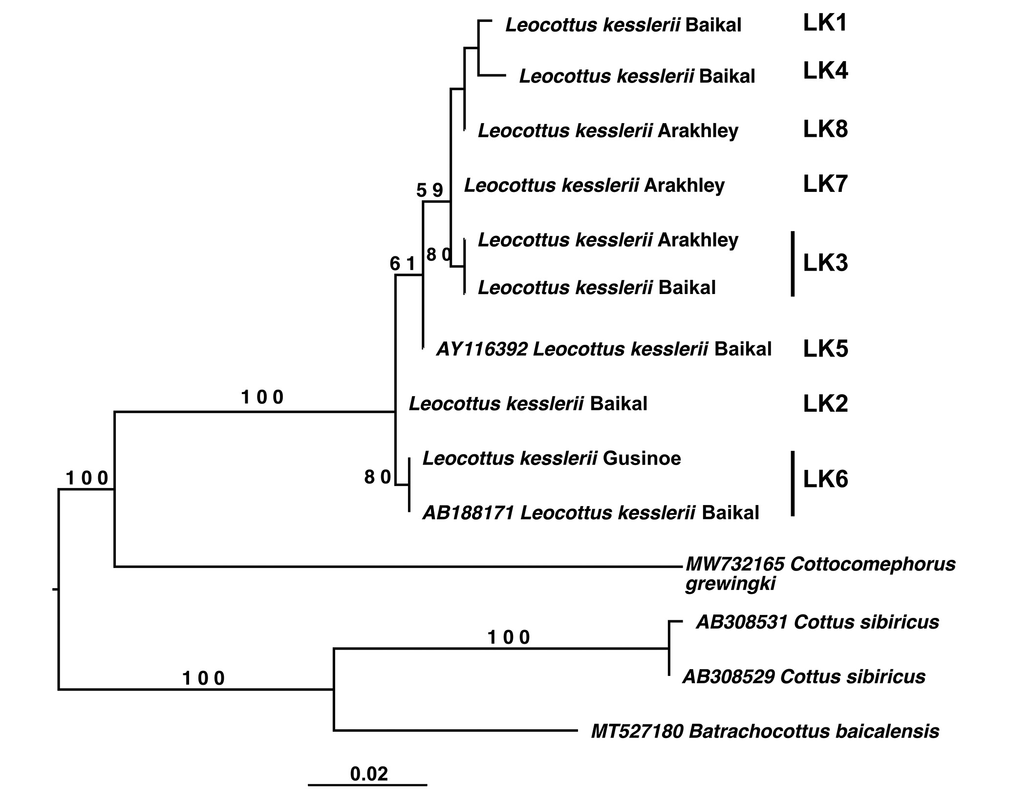 Для изучения генетической дифференциации в качестве генетического маркера выбран контрольный регион (CR) митохондриальной ДНК. Этот маркер успешно используется при молекулярно-генетических исследованиях коттоидных рыб (Yokoyama et al., 2008; Sideleva et al., 2022). Для молекулярно-генетического анализа мтДНК использованы образцы тканей особей L. kesslerii из трех локалитетов (озер Байкал, Гусиное и Арахлей), по 5 экз. в каждом. Кроме того, использованы доступные последовательности из GenBank NCBI.