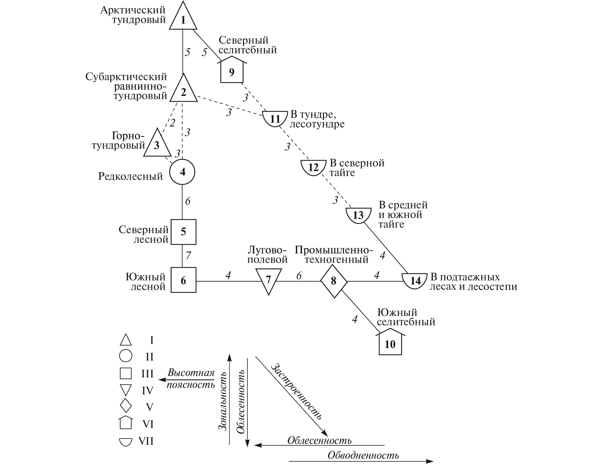 Рис. 1. Пространственно-типологическая структура населения птиц Средней Сибири. Орнитокомплексы: I – тундр, II – редколесий, III – лесов, IV – лугов и полей, V – промышленно-техногенных ландшафтов, VI – городов и поселков, VII – озер и рек. 1–14 – номера типов населения птиц, которые соответствуют таковым в тексте статьи. 2–7 – сходство между типами: сплошные линии – значимое сходство, прерывистые линии – максимальное сходство при отсутствии значимого сходства. Стрелками показаны основные направления пространственной изменчивости сообществ птиц и определяющие их факторы среды.