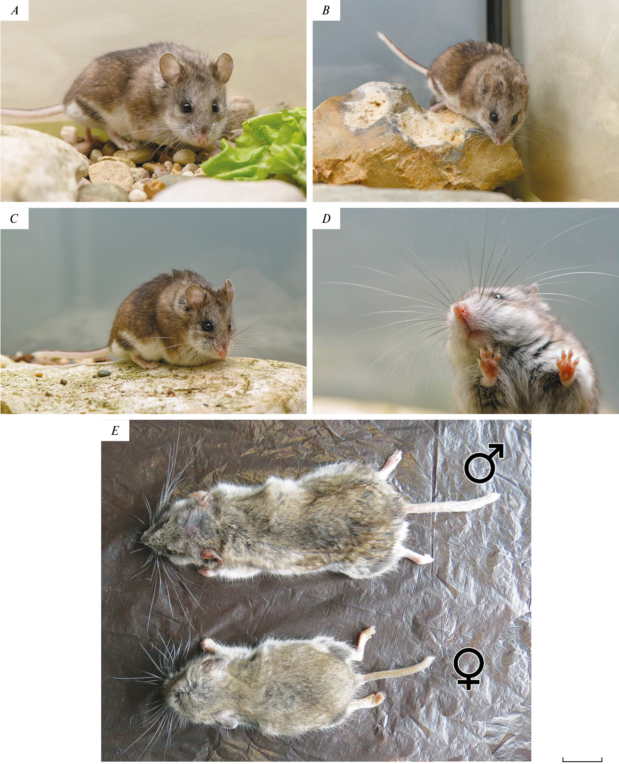 2. Рис. 1. Внешний вид взрослых особей Urocricetus kamensis: A–D – самка в условиях вивария ИПЭЭ РАН (D – фотоснимок через стекло вольера, хорошо различимы крупные подошвенные мозоли кисти); E – тушки изученных особей. Масштаб 10 мм. Фото А. В. Сурова.