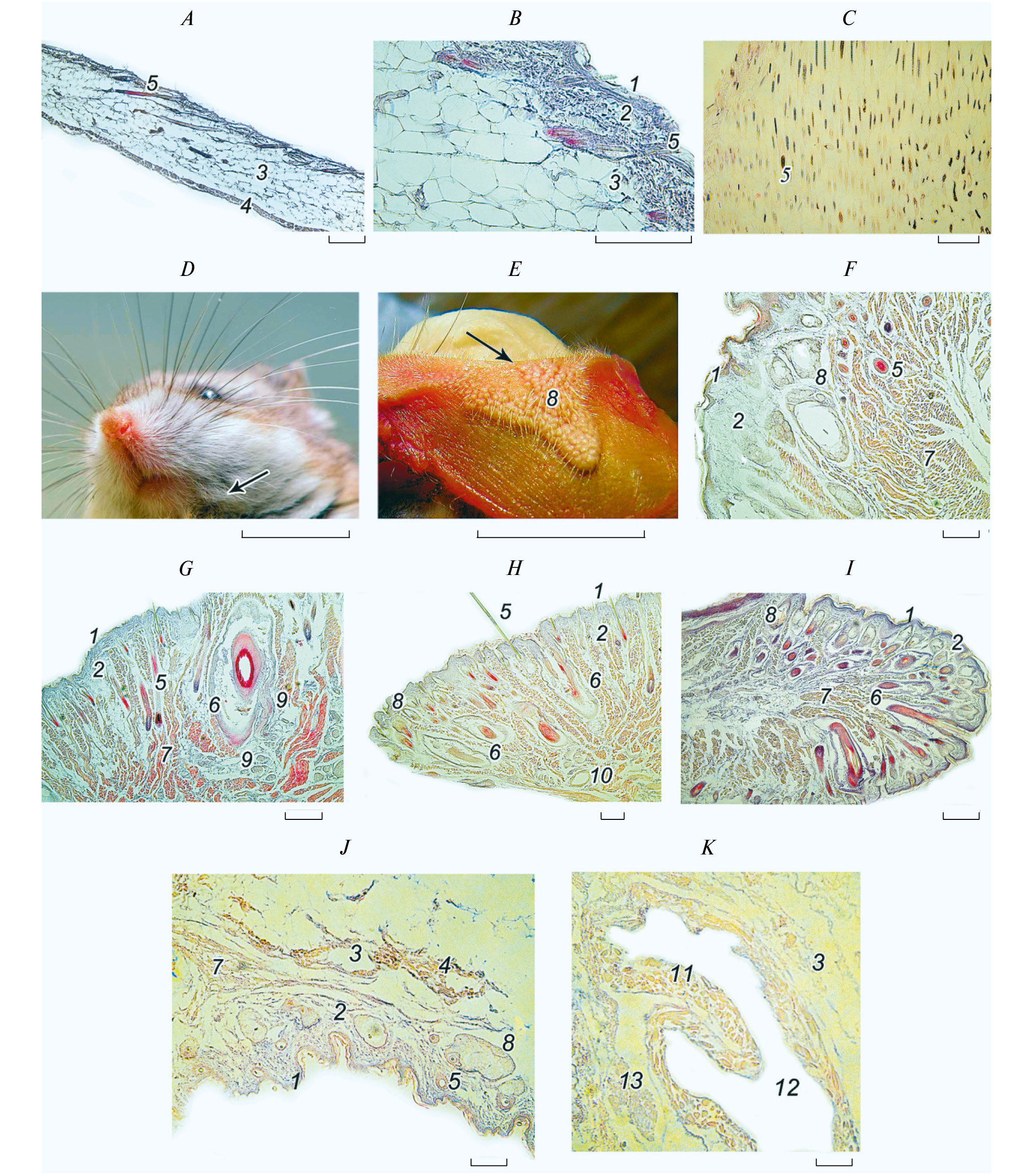 Рис. 4. Внешний вид кожи и микроструктура ее компонентов у взрослой самки Urocricetus kamensis. A, B – кожа холки на продольном сечении; С – то же на поперечном сечении; D – морда хомячка, стрелкой указан угол рта; Е – железистое поле угла рта; F – сальные железы угла рта; G – вибриссная подушка; H – верхняя губа; I – нижняя губа; J – циркумвагинальная кожа; К – проктодеальная кожа. Окраска гистологических срезов гематоксилин-эозином. 1 – эпидермис; 2 – дерма; 3 – подкожная клетчатка; 4 – подкожная мускулатура; 5 – волосяной фолликул, волос; 6 – фолликул вибриссы; 7 – пучок мышечных волокон; 8 – сальная железа; 9 – нерв; 10 – кровеносный сосуд; 11 – анальный сфинктер; 12 – анальный канал; 13 – проктодеальная железа. Микрофото. Масштаб: AС, FI, L – 100 мкм; D–E, J, K – 10 мм.