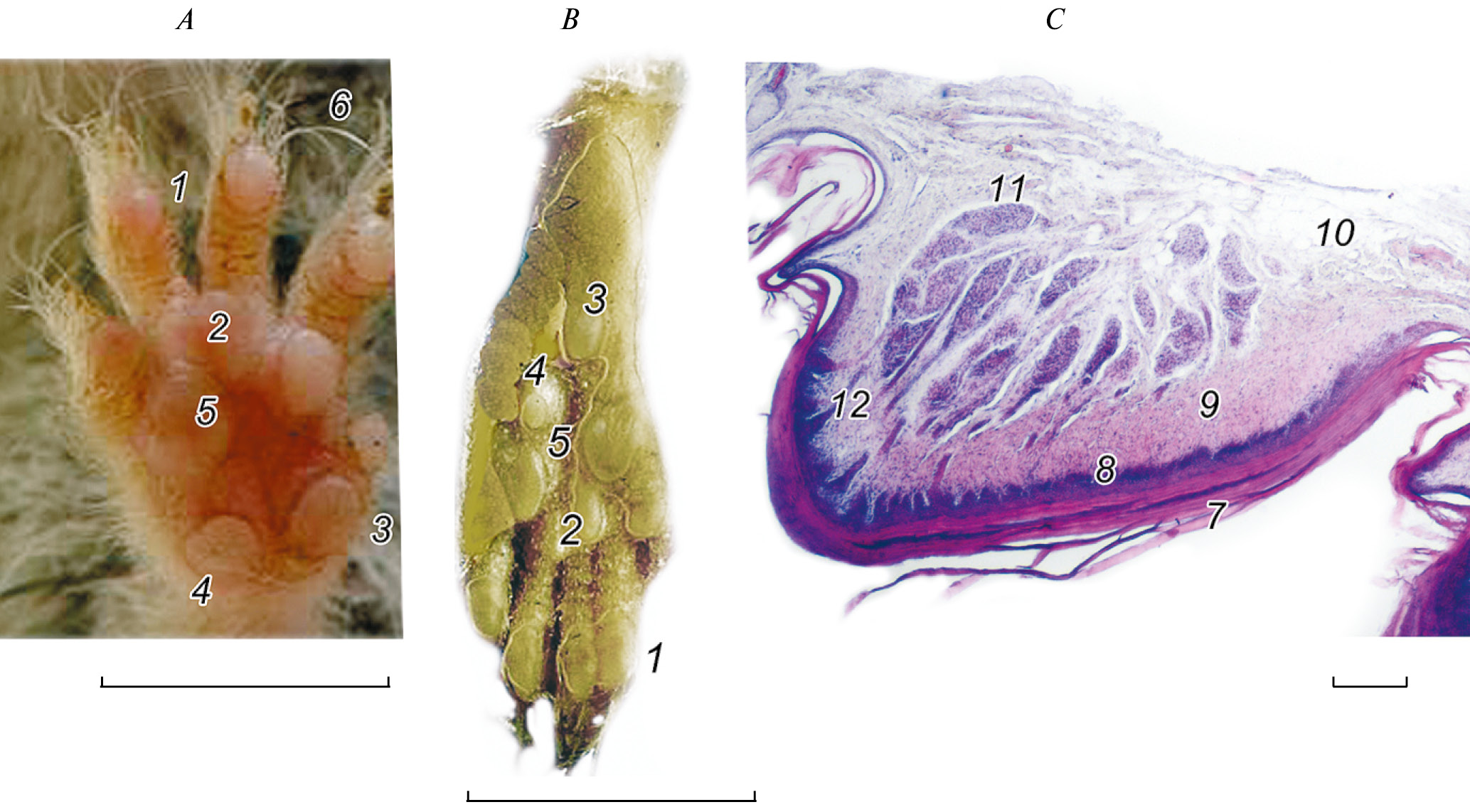6. Рис. 5. Расположение и микроструктура подошвенных мозолей у взрослой самки Urocricetus kamensis. A – волярная поверхность кисти; B – плантарная поверхность стопы; C – продольное сечение подошвенной мозоли кисти, окраска гематоксилин-эозином. Мозоли: 1 – пальцевые; 2 – метакарпальные/метатарзальные; 3 – тенар; 4 – гипотенар; 5 – центральная; 6 – волос; 7 – роговой слой; 8 – сосочковидный эпидермис; 9 – дерма; 10 – подкожная жировая клетчатка; 11 – эккриновая железа; 12 – проток эккриновой железы. Микрофото. Масштаб: A, B – 10 мм; С – 100 мкм.