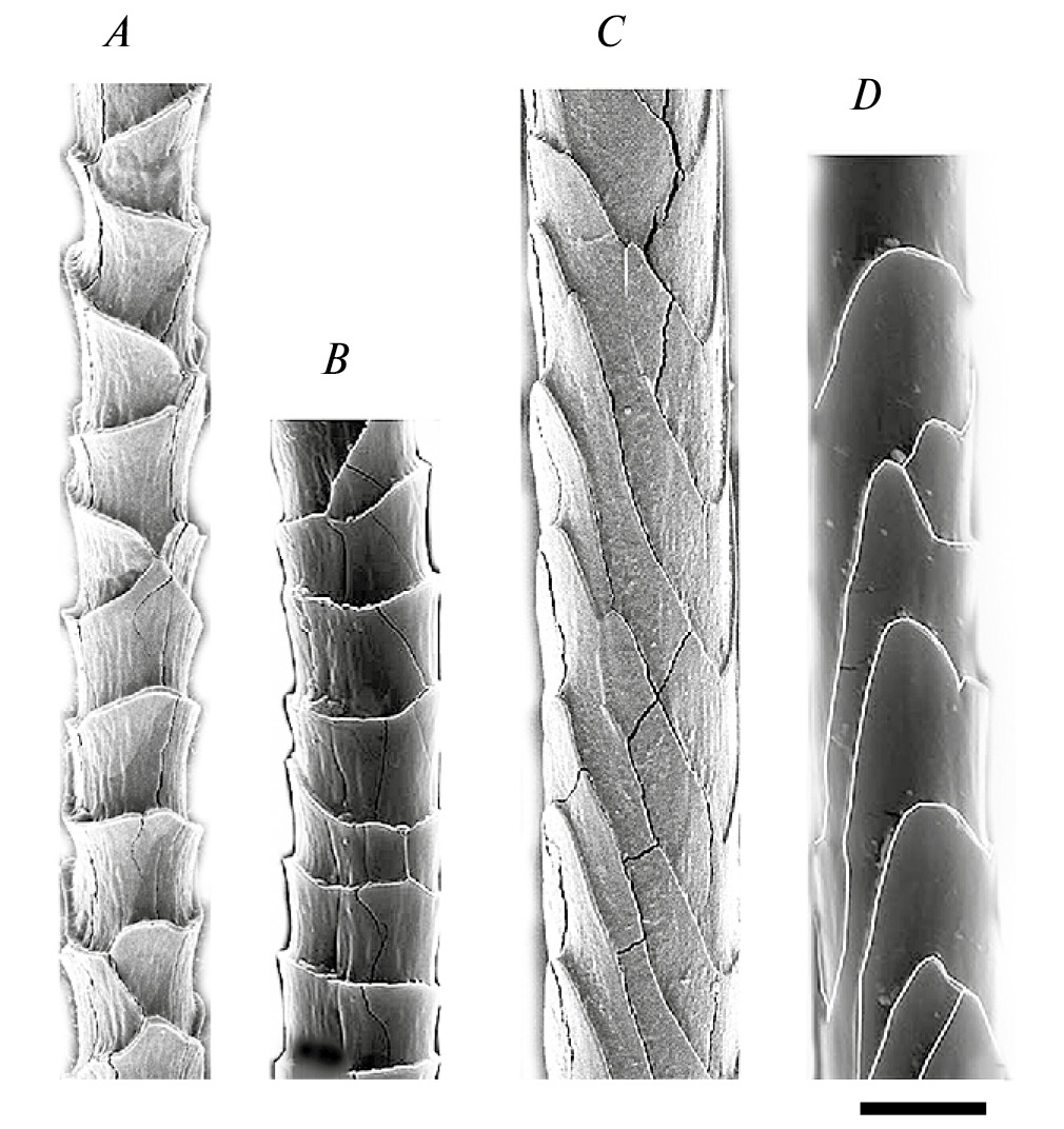 7. Рис. 6. Сходство орнамента кутикулы остевых волос холки Urocricetus kamensis (A, C), Phodopus sungorus (B) и Ph. campbelli (D). A, B – основание волоса; C, D – выше по стержню перед гранной. Данные РЭМ. Масштаб 10 мкм.