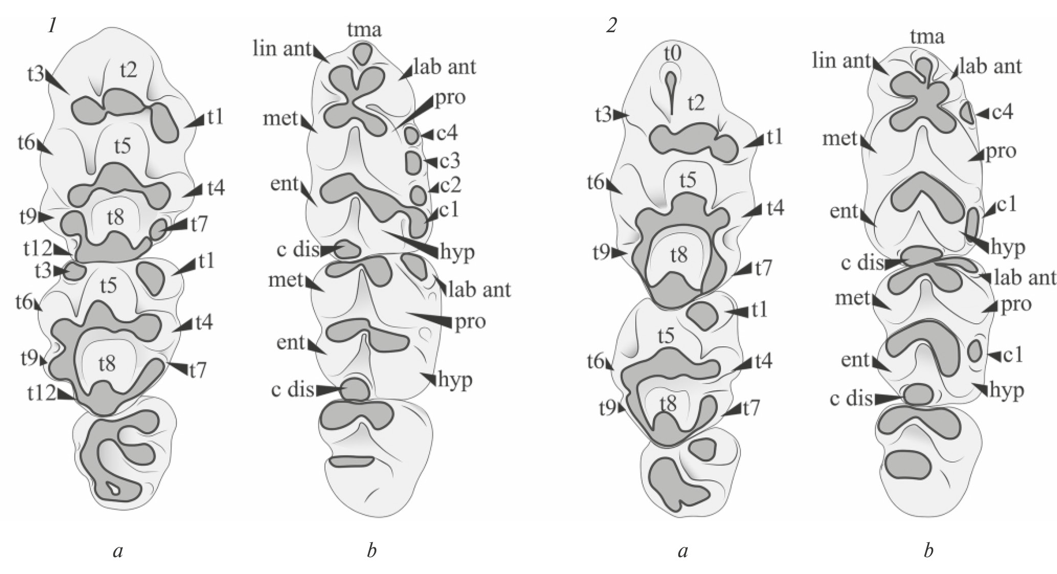 Рис. 2. Номенклатура бугорков жевательной поверхности (по: Storch, 1987) на примере верхнего (a) и нижнего (b) зубного ряда малой лесной (1) и полевой (2) мышей. t0–t12 – tubercule (бугорок), tma – медиальный антероконид, lab ant –лабиальный антероконид, lin ant – лингвальный антероконид, met – метаконид, pro – протоконид, ent – энтоконид, hyp – гипоконид, c dis – задний цингулид, с1–с4 – бугорки дополнительного буккального ряда (цингулярные конули).
