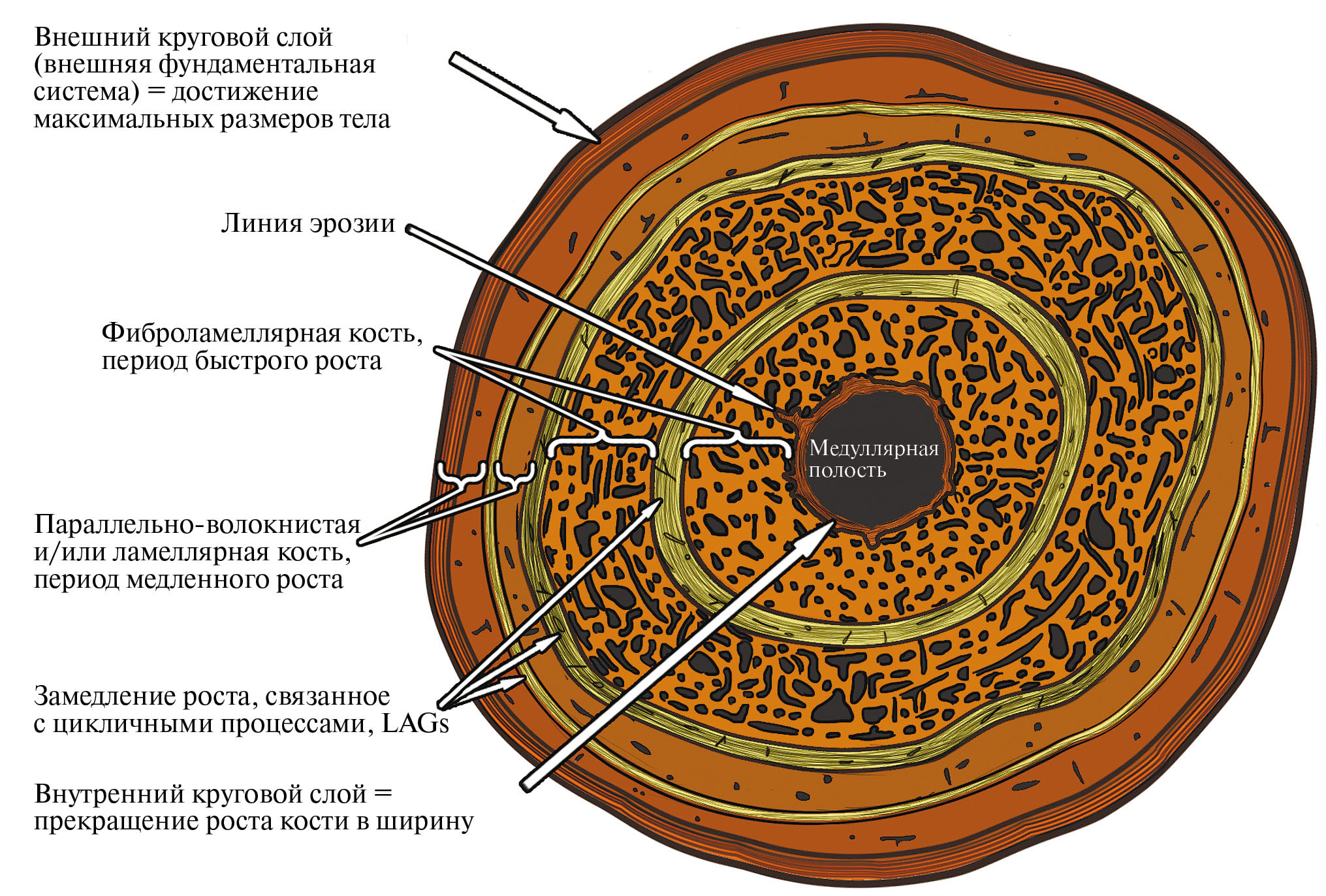 В трубчатых костях (в костях конечностей) в онтогенезе могут формироваться круговые слои плотной костной ткани: внешний (OCL, outer circumferential layer) и внутренний (ICL, inner circumferential layer) (рис. 2, 5Г). Они имеют различную природу и строение: внешний круговой слой формируется как слой плотной ламеллярной или параллельно-волокнистой костной ткани в периферической внешней части периостелиального кортекса, а внутренний круговой слой – как выстилка медуллярной полости ламеллярной костью эндостелиального происхождения. Таким образом, рост внешнего кругового слоя происходит центробежно, а внутреннего кругового слоя центростремительно.