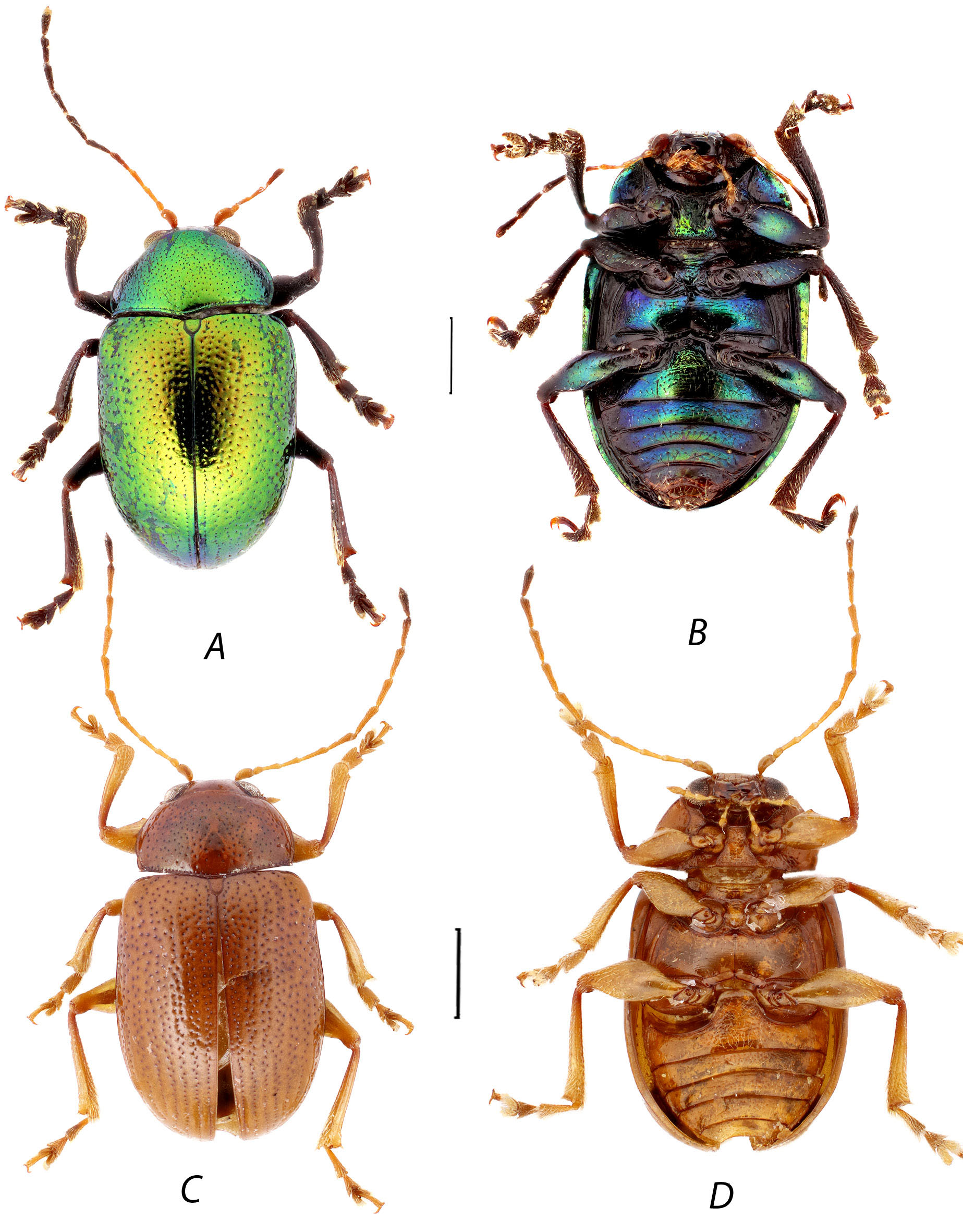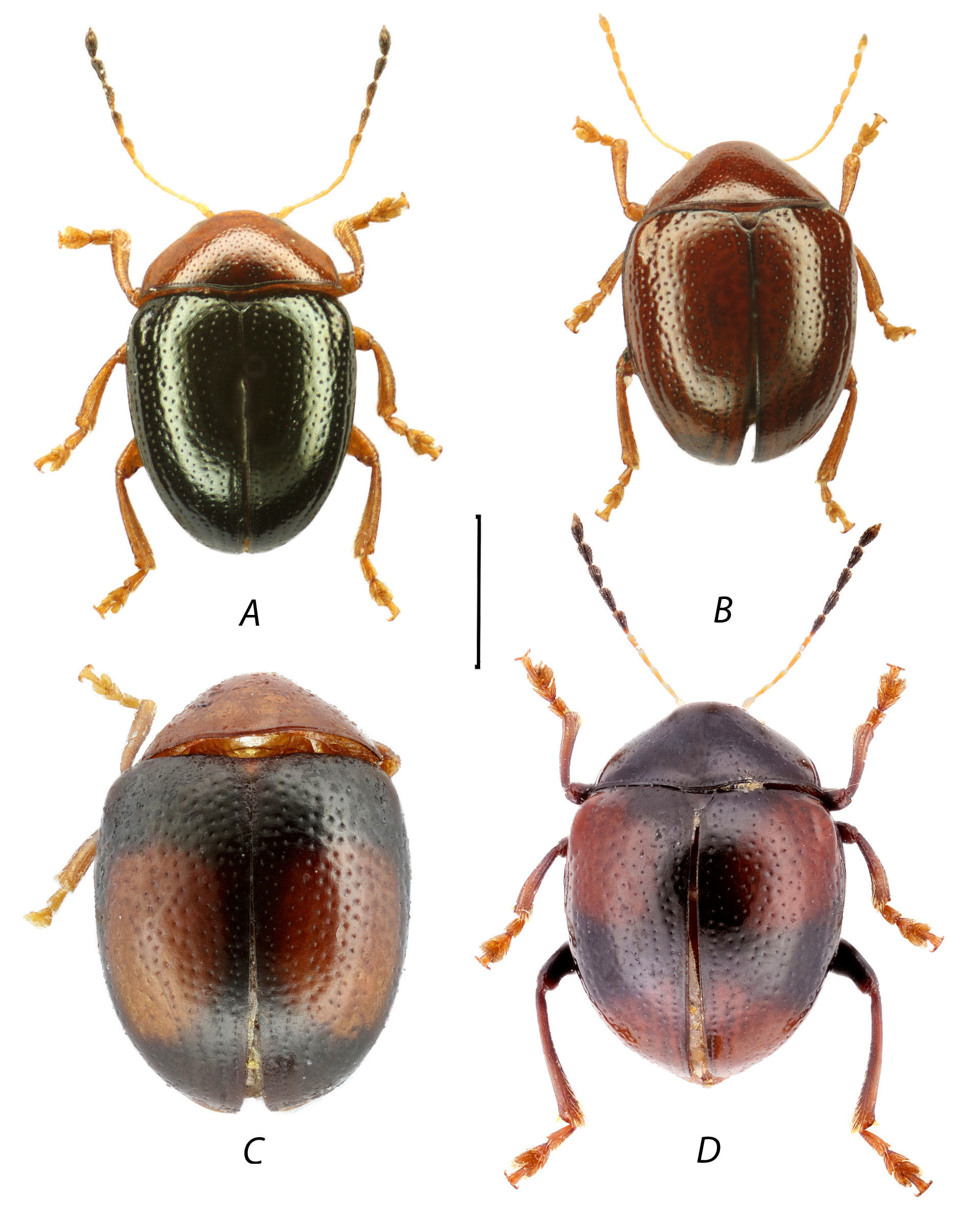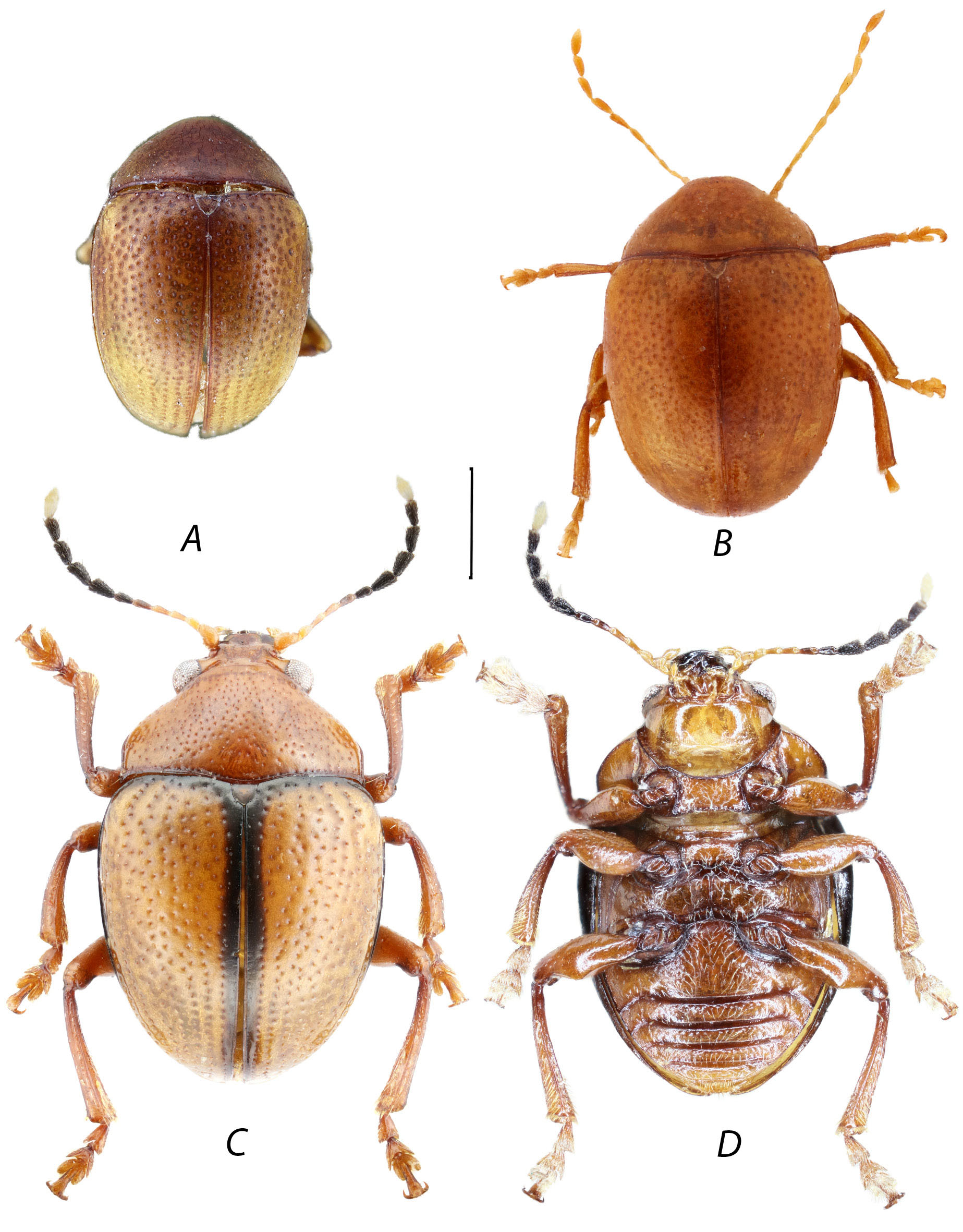 Рис. 1. Aulacia, внешний вид: A–B – A. bicoloricollis (L. Medvedev Romantsov 2014) (A – самец, голотип, B – самка, паратип); С – A. bipustulata Baly 1867; D – A. brunnea Jacoby 1894 (самец с Суматры). Масштаб 1.0 мм.