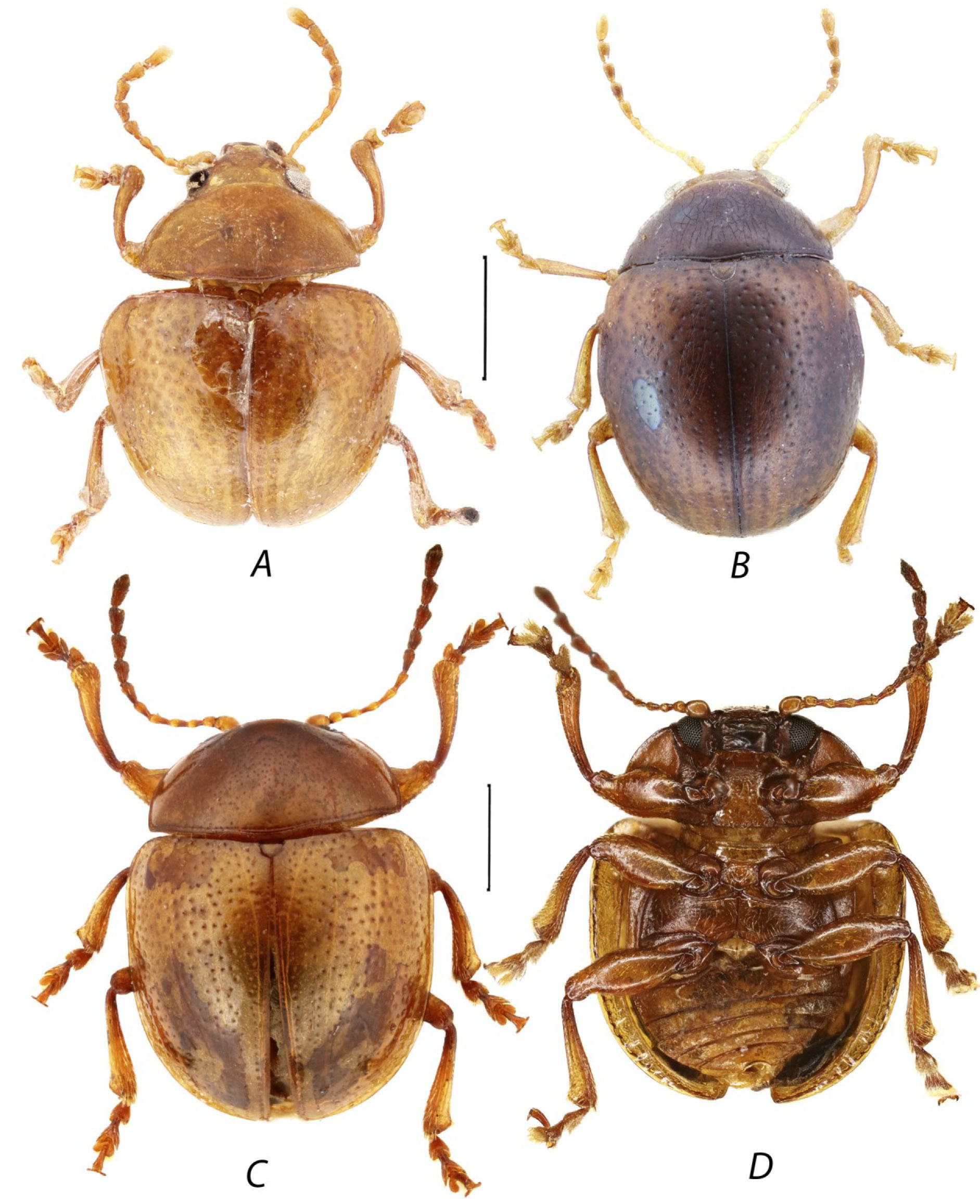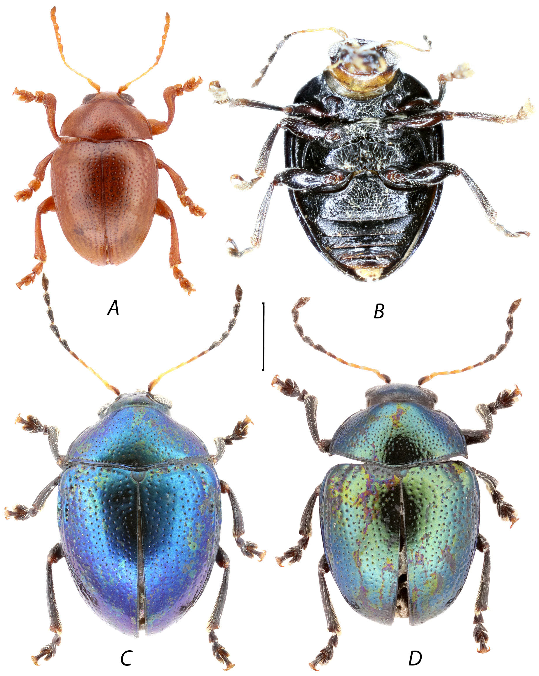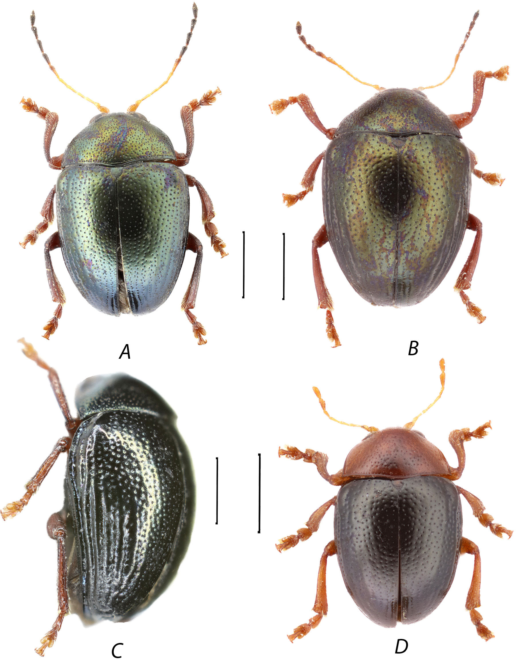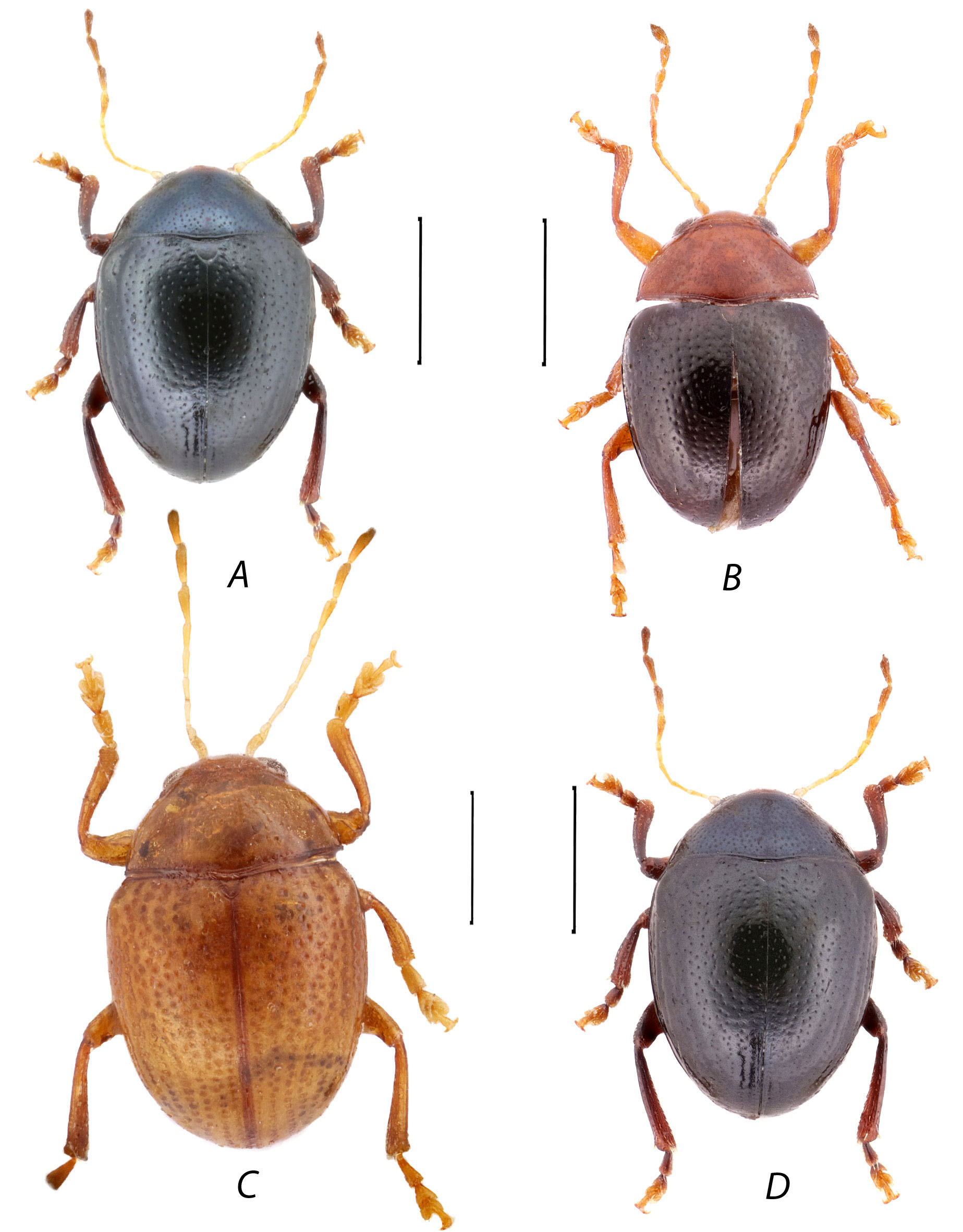 Рис. 2. Aulacia, внешний вид сверху: A – A. brunnea Jacoby 1894 (самец, светлая форма с Суматры); B–С – A. cechovskyi L. Medvedev 2016 (B – самец, С – самка); D – A. cyaneipennis (L. Medvedev 2010). Масштаб 1.0 мм.