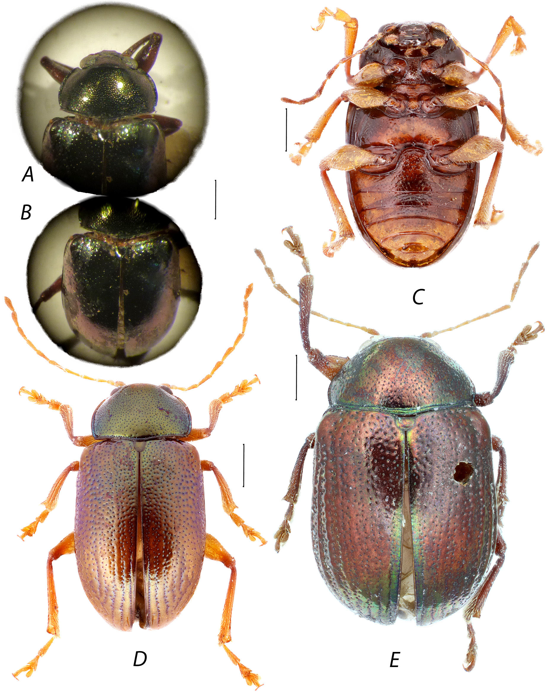 Рис. 7. Aulacia, внешний вид сверху: A – A. minuta (L. Medvedev 1995) (самец, паратип); B – A. nigella (Weise 1922) (самец); С – A. ornata Jacoby 1896 (самка, паралектотип); D – A. riedeli L. Medvedev 2004 (самка, паратип); E – Aulacia sp. (самец, Лузон). Масштаб 1.0 мм.