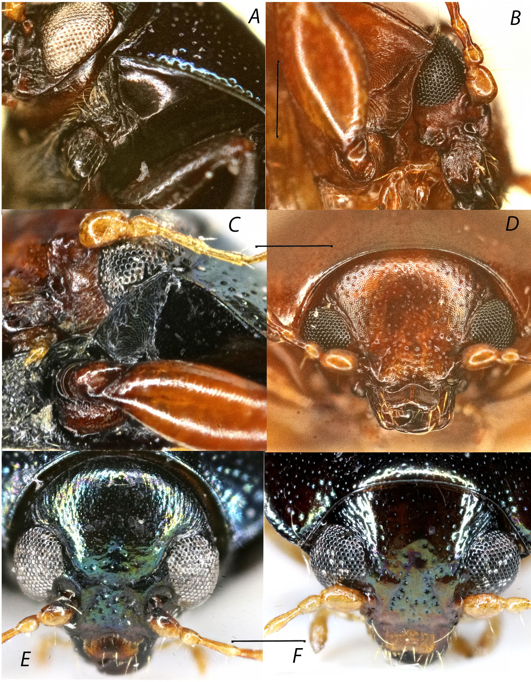 4 (3) Тело обычно крупнее, более или менее параллельностороннее или слабо расширяющиеся в апикальной трети (реже надкрылья округленные на боках с максимальной шириной посередине). Лоб не выпуклый (или очень слабо выпуклый), без четких бороздок по краям глаз (рис. 11F). Переднеспинка у́же (обычно менее чем в два раза шире длины). Надкрылья обычно в 1.2–1.4 раза длиннее их общей ширины. Боковые промежутки на надкрыльях у самок иногда с бугорками, без килевидно выступающих промежутков (в редких случаях на боках бывают слабо выступающие килевидные промежутки, но в этом случае форма тела и эдеагуса типичные для Colaspoides). Передние края боковых ветвей переднегруди более сильно выпуклые (как на рис. 9В, 9D, 10C). Mежтазиковые отростки передне- и среднегруди обычно квадратные или узко-прямоугольные (редко широко-прямоугольные), часто заметно у́же, чем ширина тазиковых впадин (особенно это характерно для отростков среднегруди). Эдеагус более широкий, обычно не более чем в 5 раз длиннее своей ширины (часто менее). Встречаются почти всесветно (кроме Африки и Антарктиды).