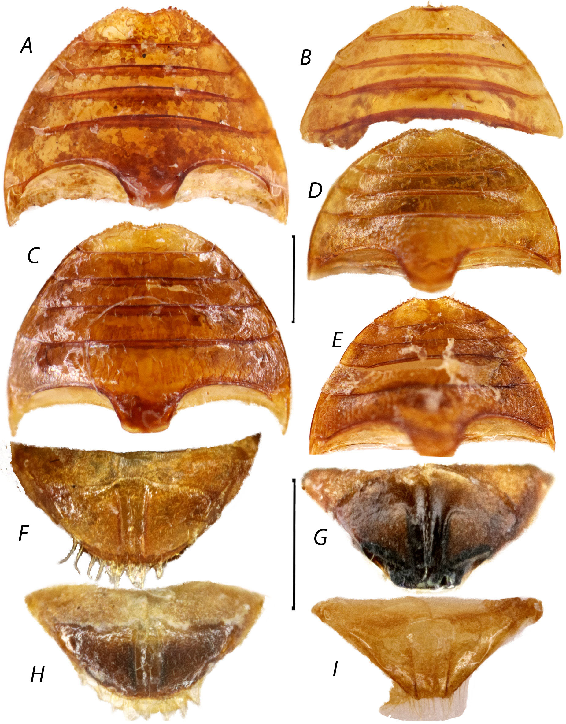 Половой диморфизм. У единственного самца, пигидий которого достаточно склеротизован, чтобы разглядеть детали, срединная бороздка неглубокая, но хорошо развитая, слегка расширяющаяся в основании и на вершине, с очень тонким продольным килем на дне. Самка похожа на самцов, но срединная бороздка пигидия у нее более узкая, чем у самцов, апикальная сторона пятого вентрита при взгляде сверху с более узкой неглубокой выемкой посередине; при взгляде сбоку середина апикального края слегка отогнута вниз. Сперматека (рис. 18J–18K) крючковидно изогнута, с длинной и широкой базальной частью, которая лишь ненамного короче и у́же ее основной части. Длина склеротизованной части сперматеки 0.38 мм.