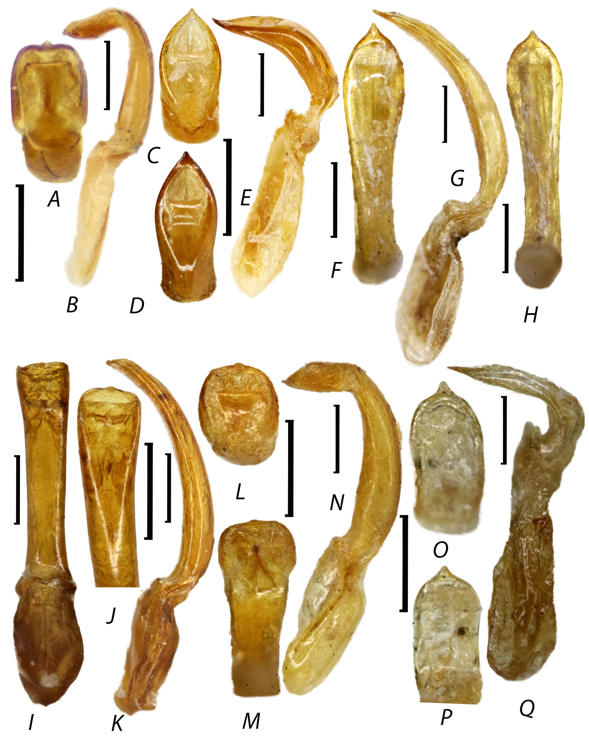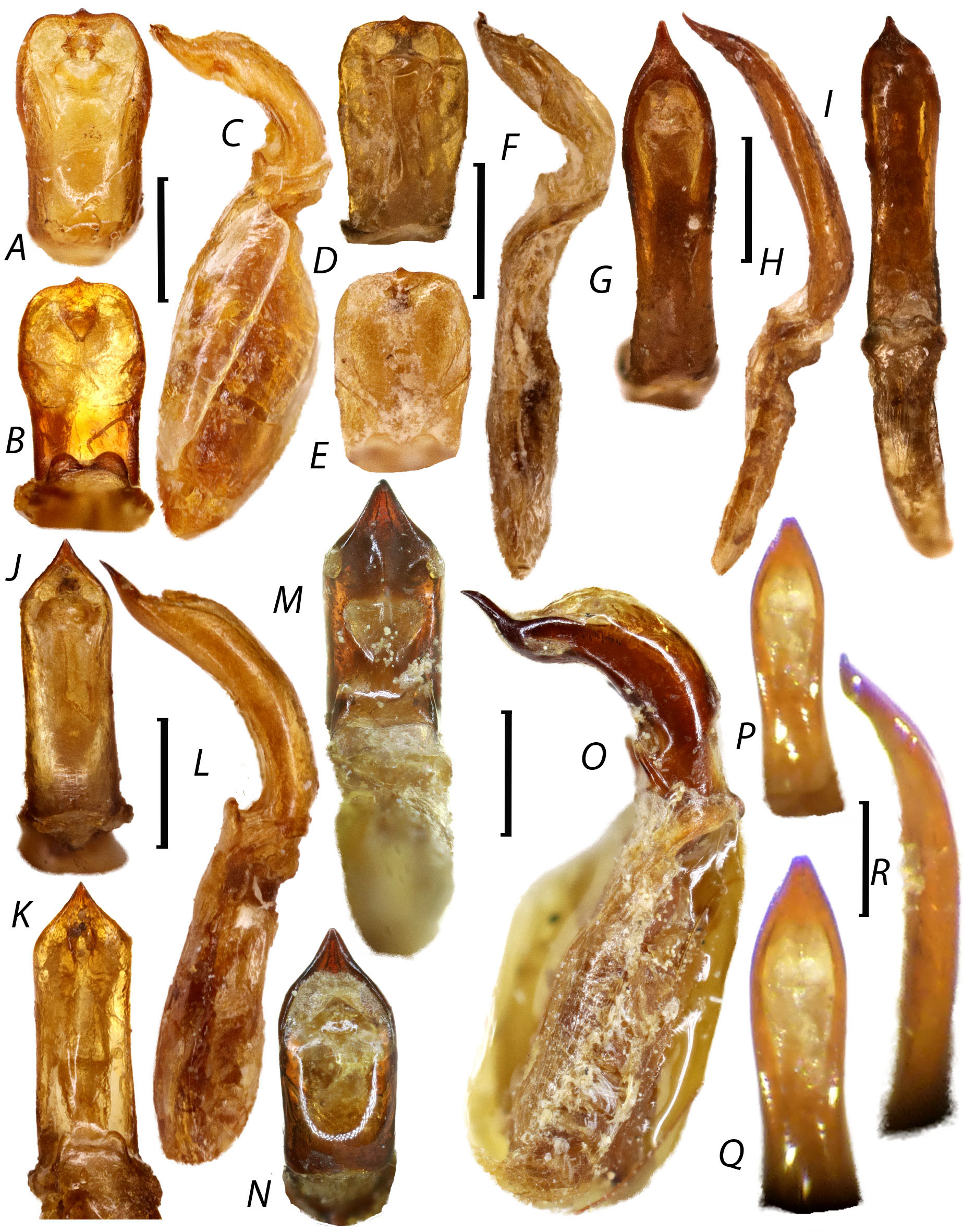 Рис. 17. Colaspoides, эдеагусы (A, D, G, J, N, P, Q – вид сверху; C, F, H, L, O, R – вид сбоку; B, E, I, K, M – вид снизу): A–C – C. fuscoaenea Baly 1867 (экземпляр с Борнео); D–F – C. fuscoaenoides Romantsov sp. n., голотип; G–I – C. filimonovi Romantsov sp. n., голотип; J–L – C. pangrangensis Romantsov sp. n., голотип; M–O – C. varians Baly 1867; P–R – C. javana Weise 1924, голотип. Масштаб 0.25 мм.