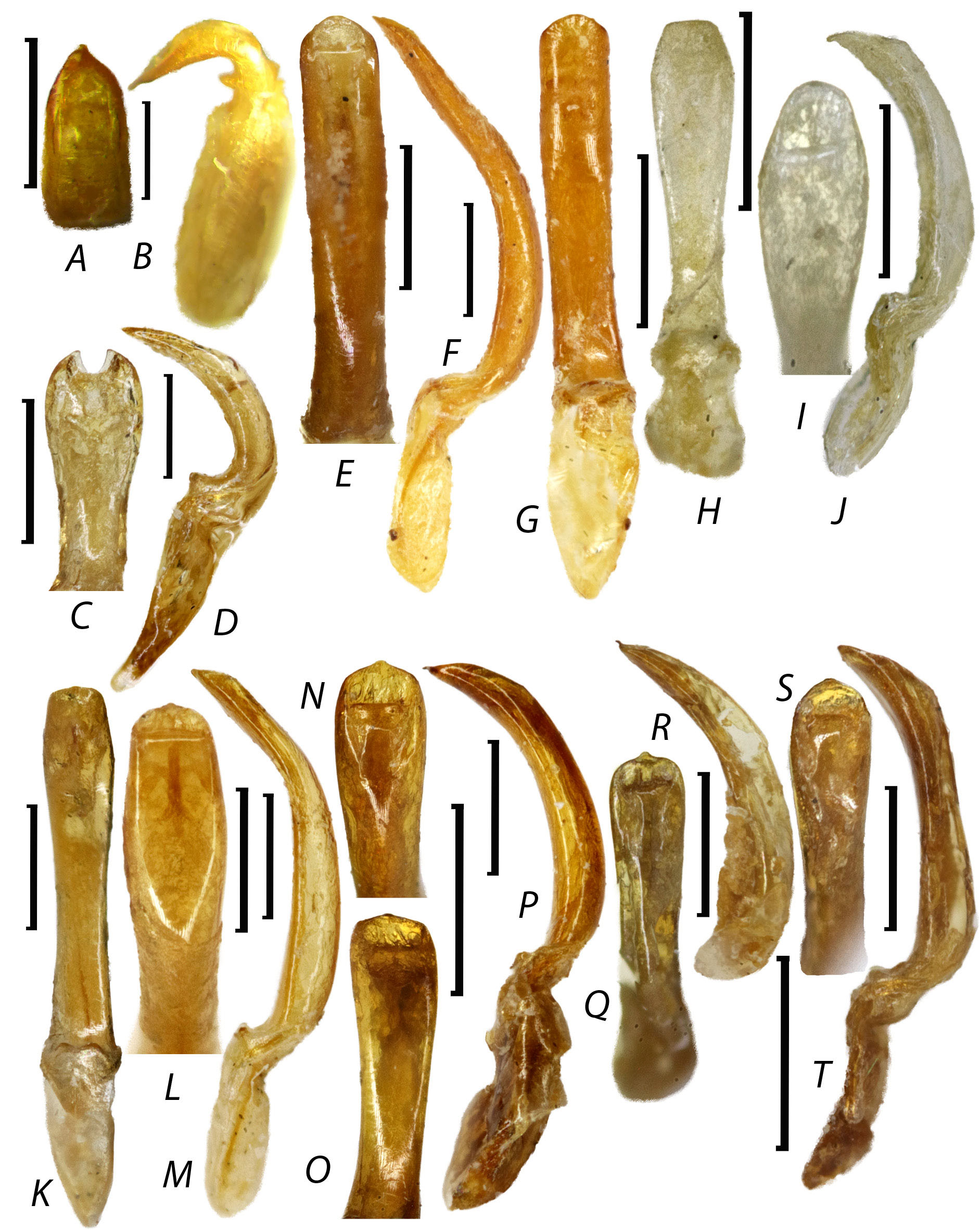 Эдеагус (рис. 17D–17F) широкий, в 4.5 раза длиннее ширины, с широко усеченной вершиной, несущей маленький зубчик посередине. В профиль вершина эдеагуса слегка отогнута кверху. Нижняя сторона эдеагуса с узкой предапикальной бороздкой, расширяющейся в виде треугольника у самой вершины. Длина эдеагуса 2.15 мм, ширина 0.5 мм.