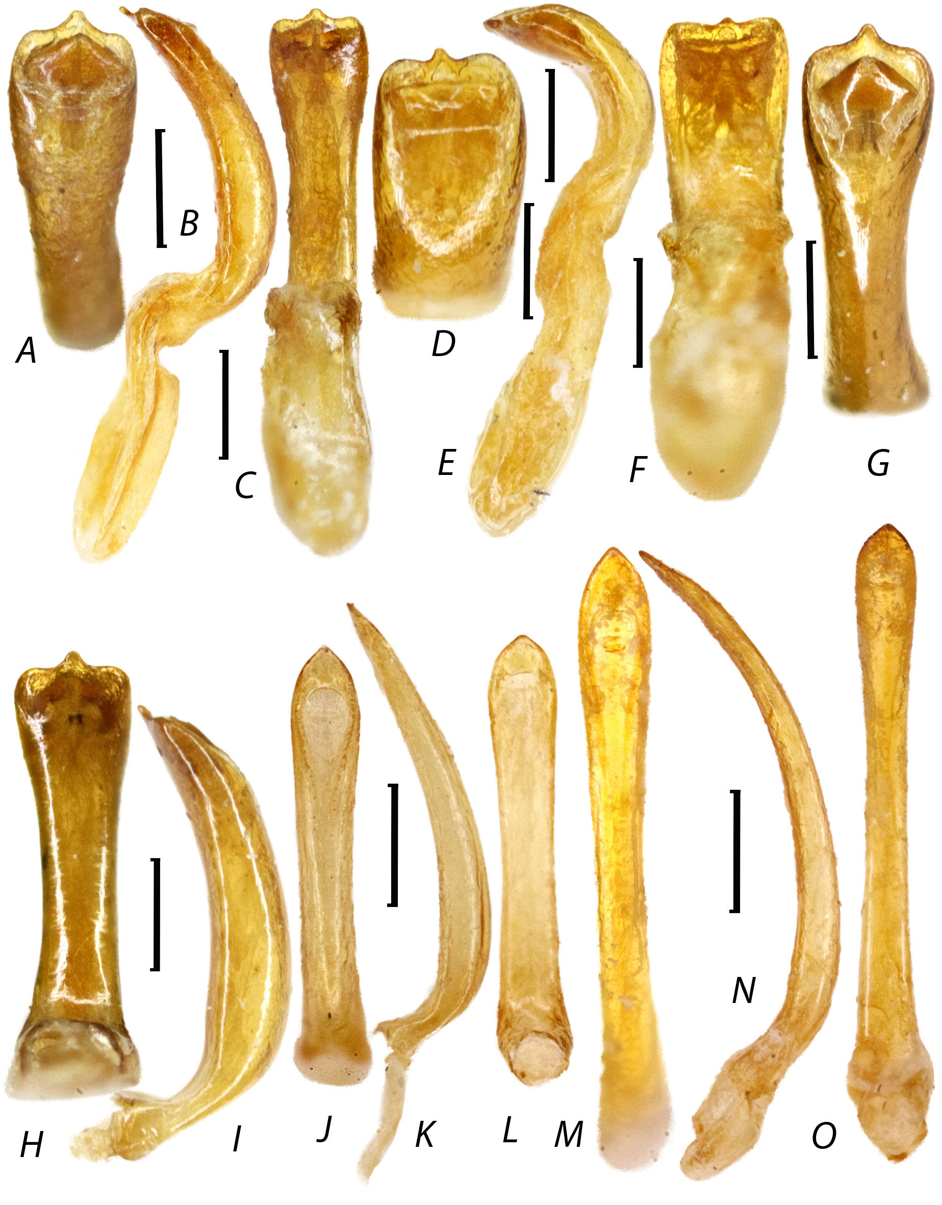 Рис. 16. Aulacia (группа видов cyaneipennis), Aulacioides, эдеагусы (A, D, G, J, M – вид сверху; B, E, I, K, N – вид сбоку; C, F, H, L, O – вид снизу): A–C – Aulacia cyaneipennis (L. Medvedev 2010); D–F – A. limbipennis Romantsov sp. n., голотип; G–I – A. moseykoi Romantsov sp. n., голотип; J–L – Aulacioides laeta (L. Medvedev 2004); M–O – A. spiridonovi Romantsov sp. n., голотип. Масштаб 0.25 мм.