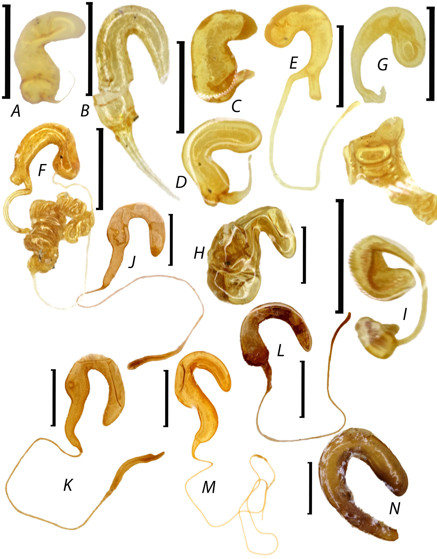 Рис. 18. Aulacia, Aulacioides, Colaspoides, сперматеки: A – Aulacia bicoloricollis (L. Medvedev et Romantsov 2014), паратип; B – A. cechovskyi L. Medvedev 2016, паратип; С – A. brunnea Jacoby 1894 (экземпляр с Фразерс Хилл); D – A. fulvipes Baly 1867 (экземпляр из Пенсиангана); E–F – A. longicostata Romantsov sp. n., паратип из Трус Мади; G – A. montana Takizawa 2017; H – A. moseykoi Romantsov sp. n., паратип; I – Aulacioides laeta (L. Medvedev 2004) (экземпляр из Танах Рата); J–K – Colaspoides fuscoaenoides Romantsov sp. n., паратип; L – C. fuscoaenea Baly 1867 (экземпляр с Борнео); M – C. pangrangensis Romantsov sp. n., паратип; N – C. varians Baly 1867. Масштаб 0.25 мм.