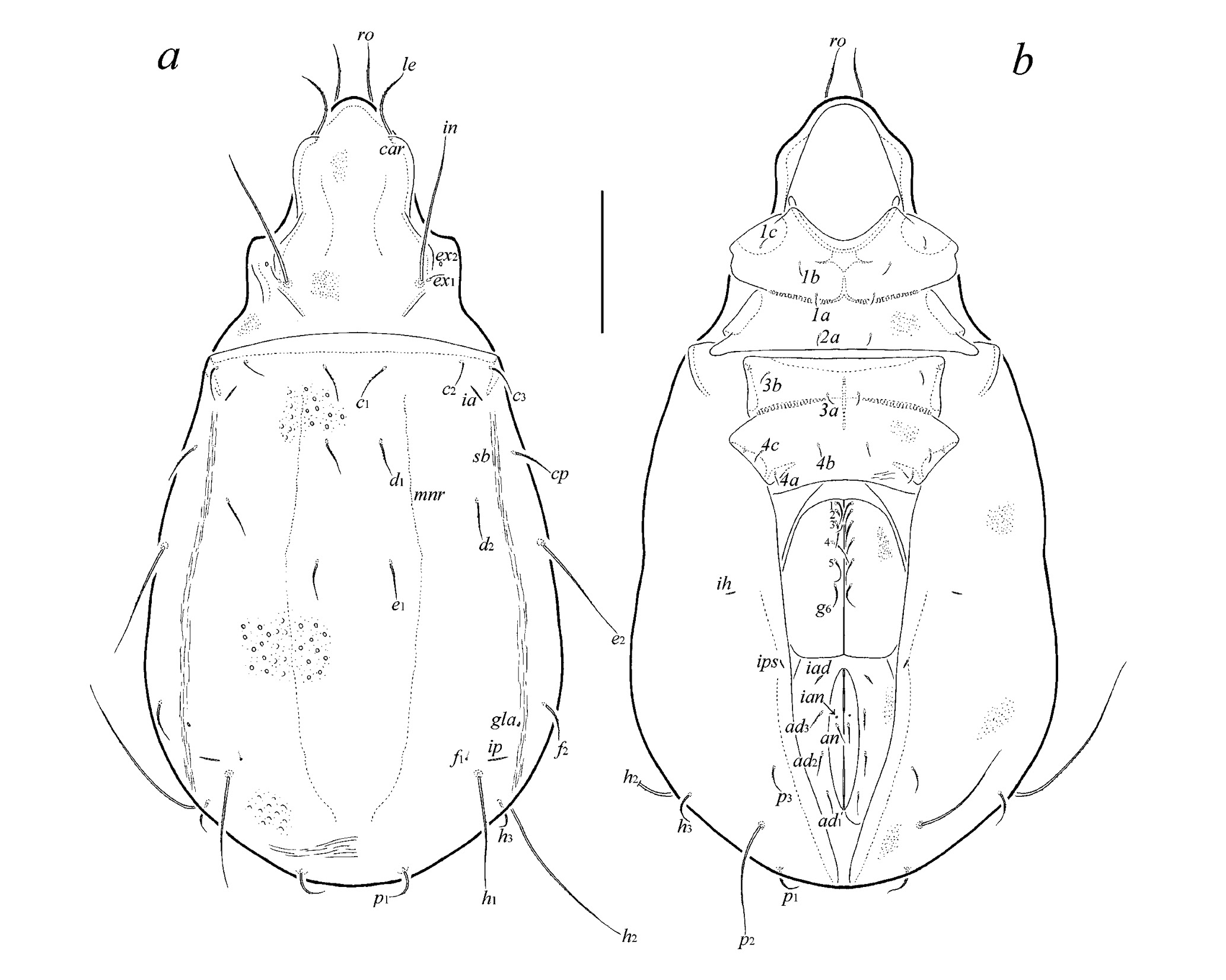 Observation and documentation. For measurement and illustration, specimens were mounted in lactic acid on temporary cavity slides. All measurements are in micrometers (μm). Body length was measured in lateral view, from the tip of the rostrum to the posterior edge of the notogaster; other structures were oriented to avoid parallax errors. Notogastral width refers to the maximum width in dorsal aspect. Setal lengths were measured perpendicular to their long axes, accounting for curvature. Formulas for leg solenidia are given in square brackets according to the sequence genu-tibia-tarsus. Drawings were made with a camera lucida using a Leica DM 2500 light microscope.