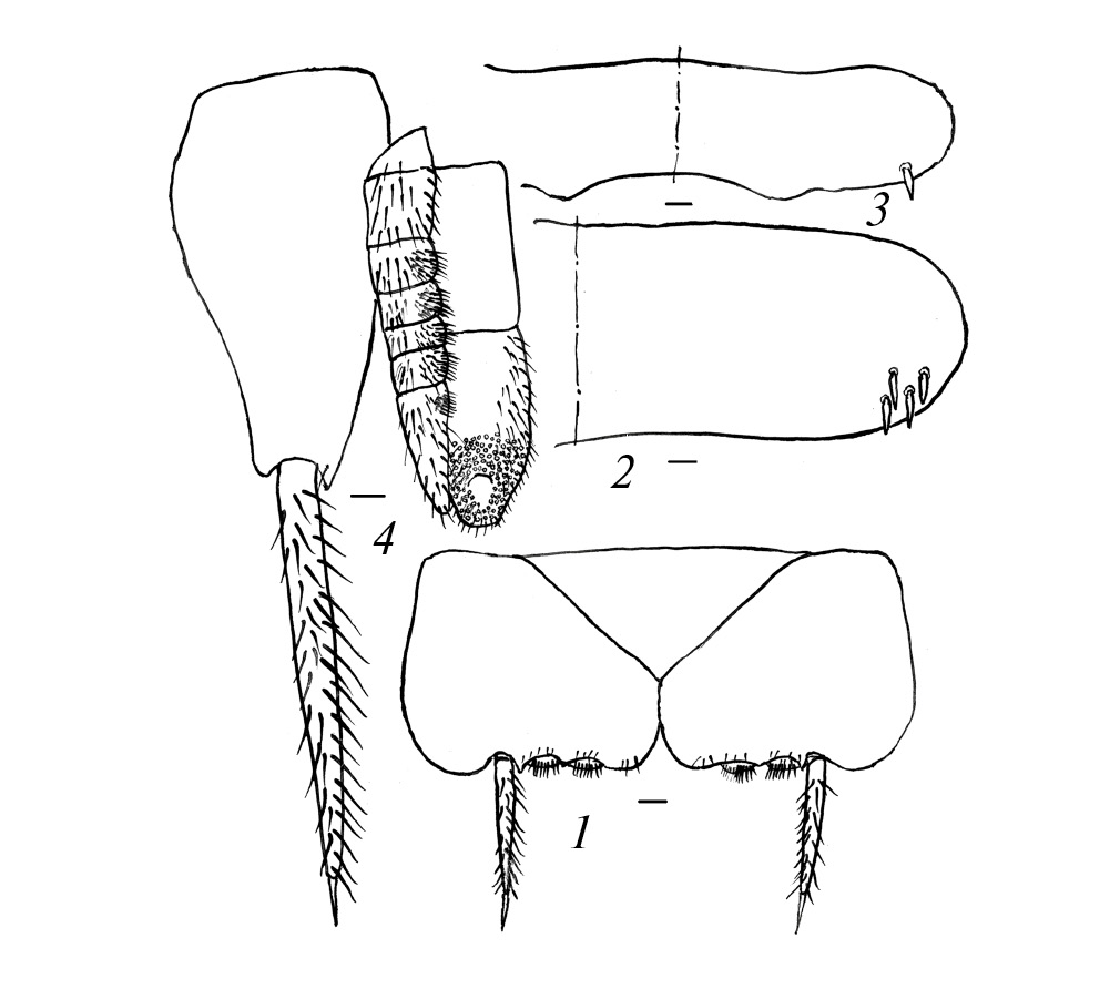 Кокситы II–IX сегментов брюшка с одной парой грифельков. Кокситы I, VI и VII сегментов брюшка самца с 1 + 1, II–V сегментов с 2 + 2 втяжными пузырьками. Вершинный угол II–IV стернитов брюшка 96°–98°, V–VI стернитов – 110°–114° (рис. 2, 1; табл. 2). Соотношения длин грифельков, стернитов и кокситов брюшка приведены в табл. 2. Грудные тергиты без макрохет. IV–X тергиты (рис. 2, 2, 3) и VI, VII кокситы брюшка с сравнительно темными и утолщенными игловидными макрохетами. Их количество и распределение на тергитах и кокситах брюшка приведены в табл. 3.