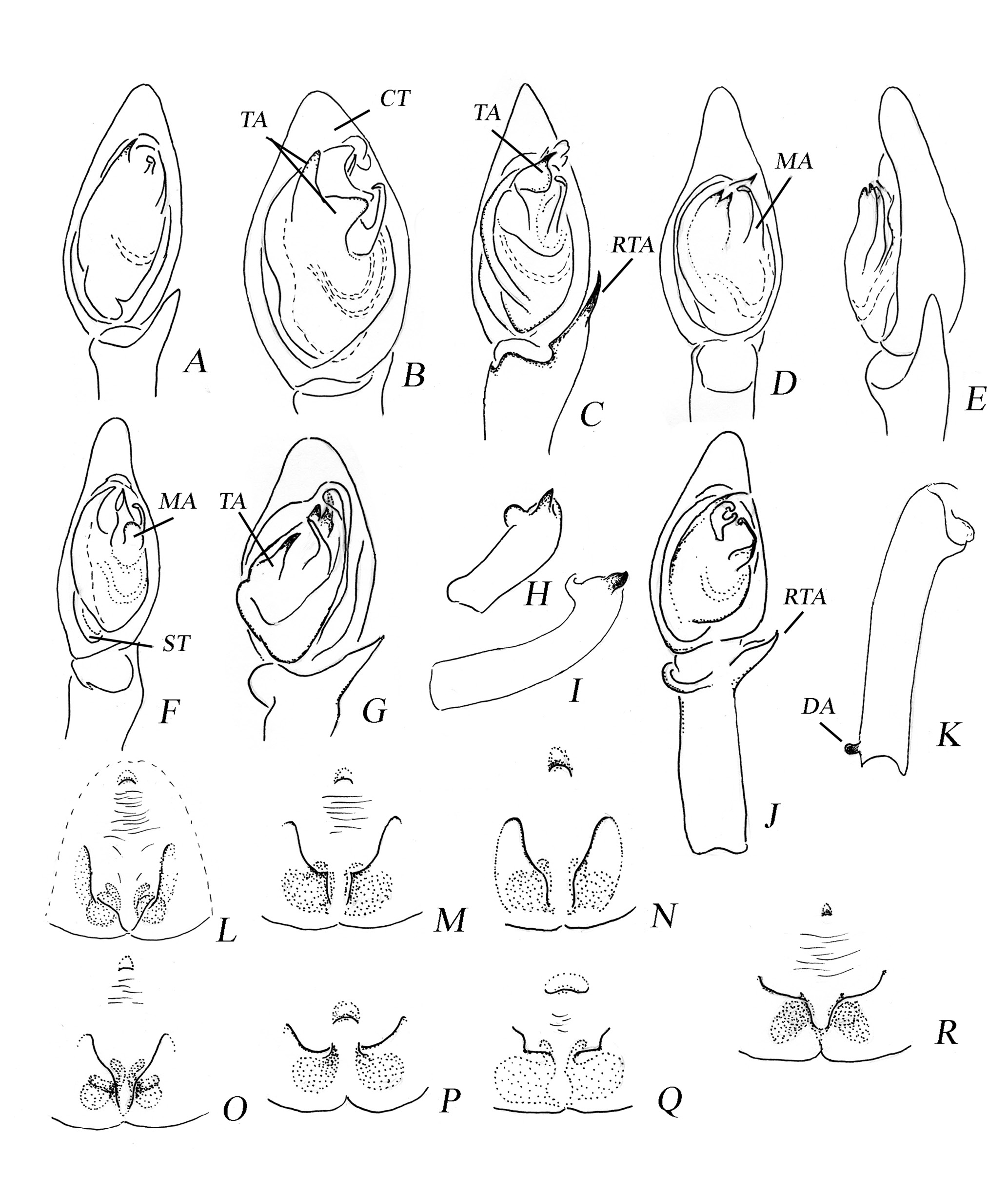 Fig. 3. Copulatory organs: A, M–M. kulczynskii Charitonov 1946; B, R – M. tenuissimus (L. Koch 1866); C, K–L–M. lubricus (Simon 1880); D–E – M. patricki Zamani et Marusik 2021; F, O – M. caucasicus Zamani et Marusik 2021; G–H, Q – M. zonsteini Mikhailov 1986; I–J, P – M. khorasanicus Zamani et Marusik 2024; N – M. iranicus Zamani et Marusik 2023. CT – cymbium tip, DA – dorsal apophysis, MA – median apophysis, RTA – retrolateral tibial apophysis, TA – tegular apophysis, ST – subtegulum.