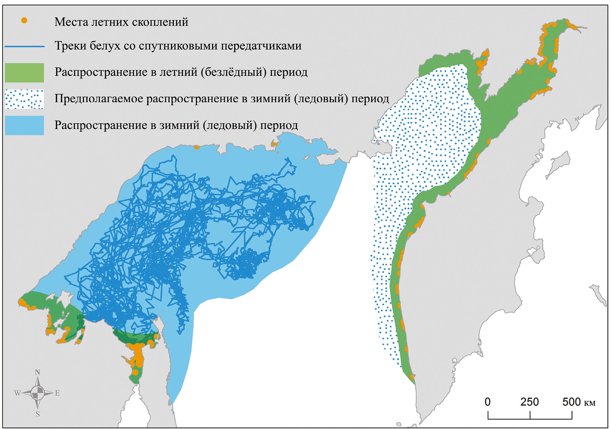 Белуха – циркумполярно распространенный монотипический вид китообразных, в России она встречается во всех арктических, а также в Белом, Беринговом и Охотском морях (Клейненберг и др., 1964; Hobbs et al., 2019). Для белух известны как далеко мигрирующие популяции – совершающие направленные перемещения от летних местообитаний к зимним, так и резидентные – не уходящие далеко от летних местообитаний в зимний период (Kovacs et al., 2011; Lydersen et al., 2001).