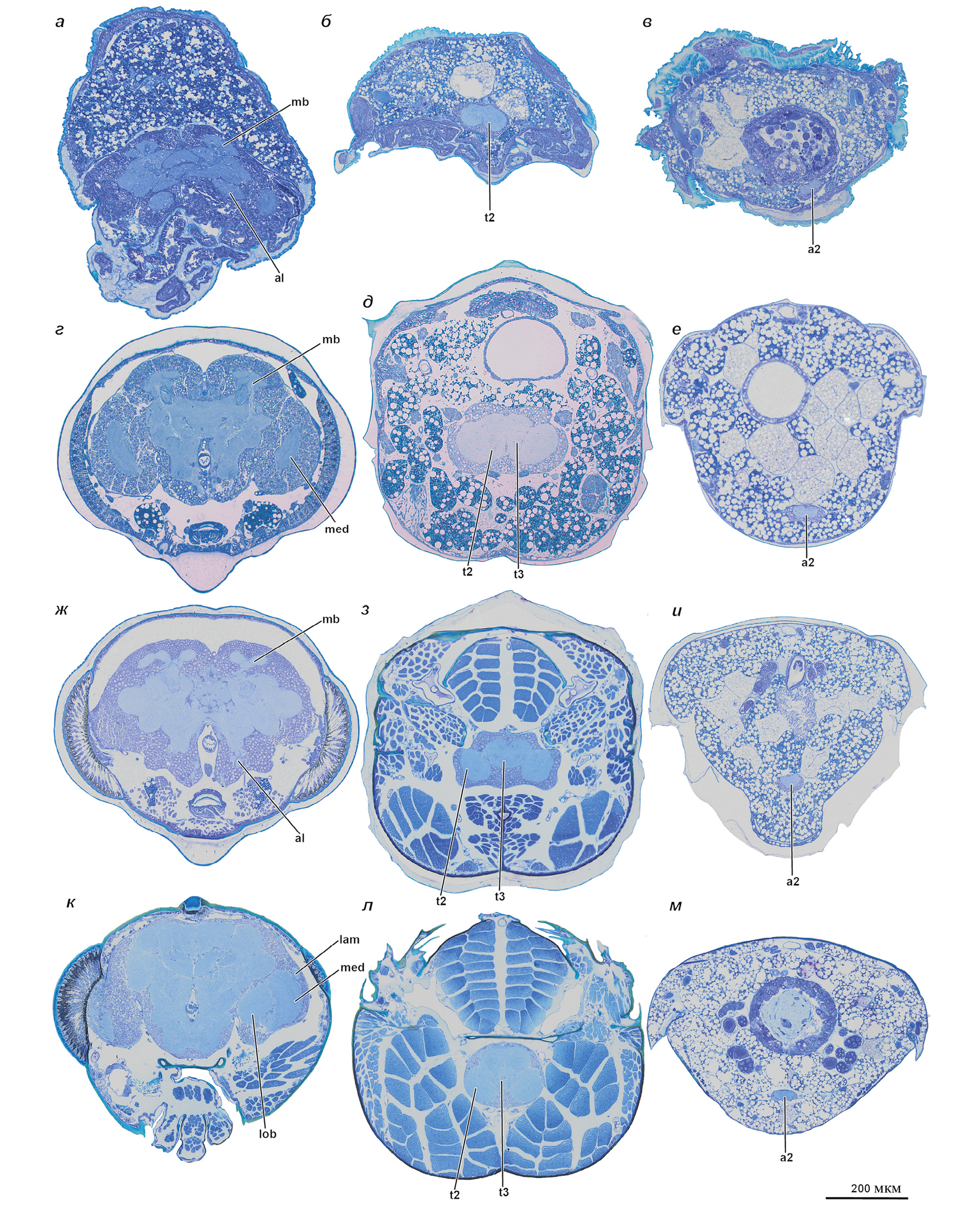 Рис. 2. Строение ЦНС предкуколки (а–в), куколки I (г–е), куколки II (ж–и) и имаго (к–м) Habrobracon hebetor, гистология: al – антеннальные доли, а2 – второй брюшной ганглий, lam – ламина, lob – лобула, mb – грибовидное тело, med – медулла, t2–t3 – средне- и заднегрудной ганглии.