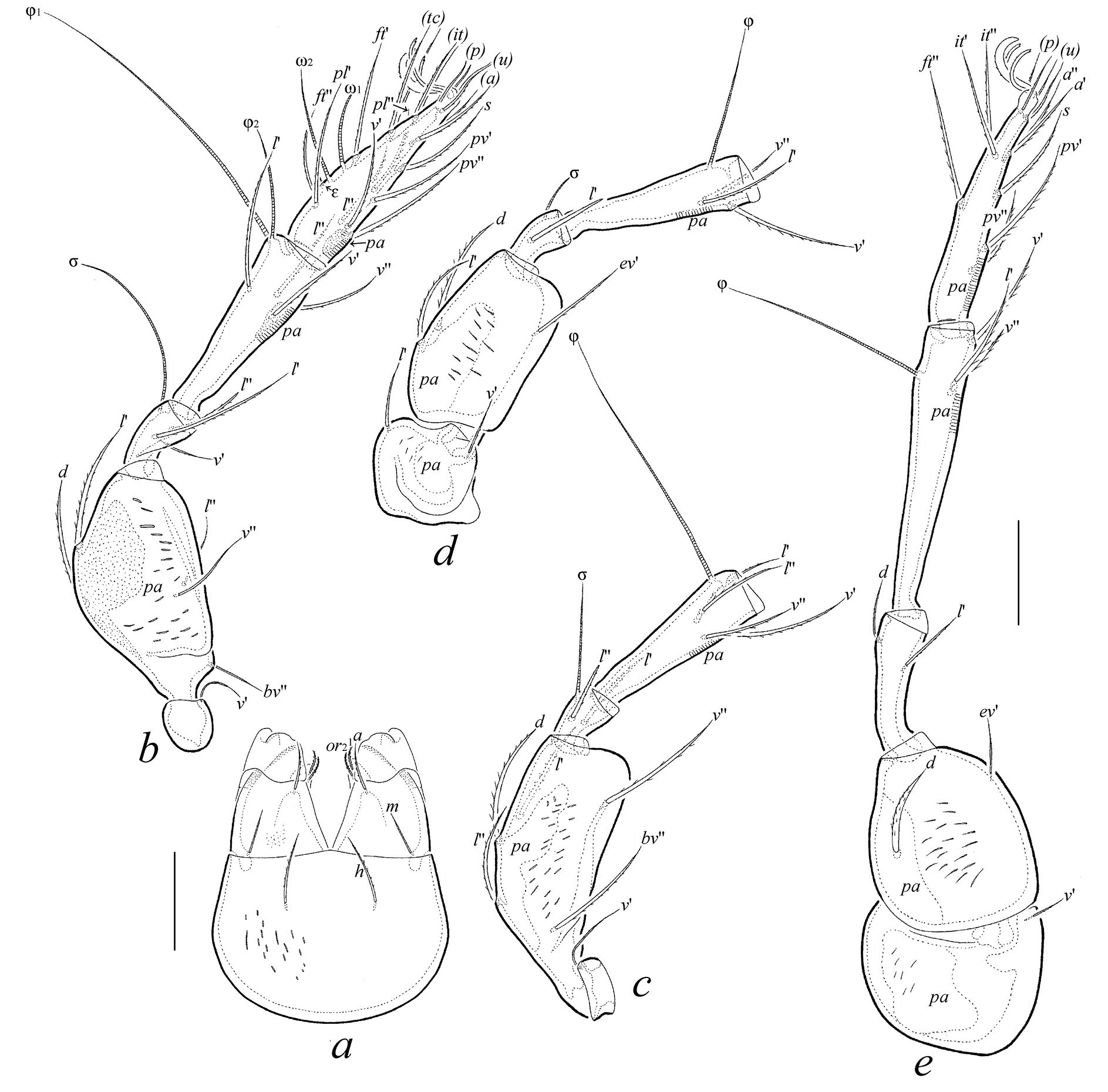 Legs. Heterotridactylous; all claws barbed on dorsal side; both lateral claws with small tooth distoventrally. Dorsoparaxial porose area on femora I–IV and on trochanters III, IV, ventrodistal porose area on tibia I–IV and proximoventral porose area on tarsi I–IV present. Formulas of leg setation and solenidia: I (1– 5–3–4– 20) [1–2–2], II (1–5–2–4–15) [1–1–2], III (2– 3–1–3–15) [1–1–0], IV (1–2–2–3–12) [0–1–0]; homology of setae and solenidia indicated in Table 1. Solenidia ω1 on tarsus I, ω1 and ω2 on tarsus II, and σ on genu III thickened, rounded distally; other solenidia setiform or subflagellate.