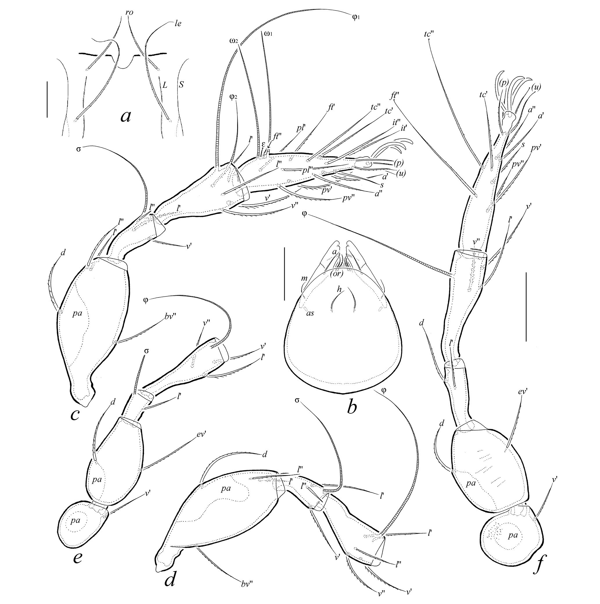 Observation and documentation. For measurement and illustration, specimens were mounted in lactic acid on temporary cavity slides. All measurements are in micrometers (μm). Body length was measured in lateral view, from the tip of the rostrum to the posterior edge of the notogaster. Notogastral width refers to the maximum width in dorsal aspect (behind pteromorphs). Setal lengths were measured perpendicular to their long axes, accounting for curvature. Formulas for leg solenidia are given in square brackets according to the sequence genu-tibia-tarsus. Drawings were made with a camera lucida using an “Olympus CX43RF” transmission light microscope.
